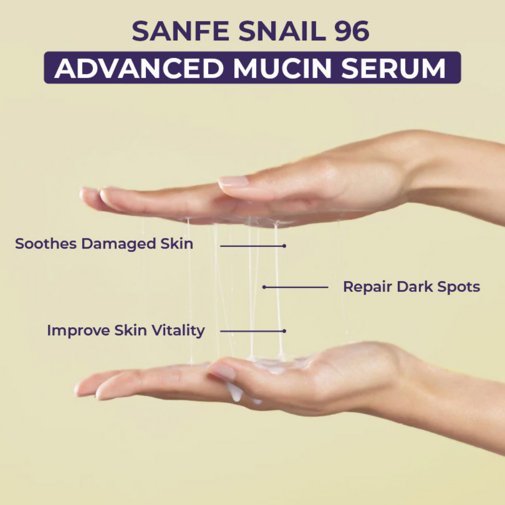 About the product:Reveal luminous and revitalized skin with the Sanfe Snail 96 Advanced Mucin Serum. This powerful formula, containing 96% snail mucin filtrate, provides deep hydration while enhancing skin suppleness and repairing damage. Perfect for addressing dullness, fine lines, and imperfections, it helps to balance skin tone and enhance vitality. Suitable for every skin type, it effortlessly fits into your skincare regimen, offering a smoother, more youthful appearance with regular application.