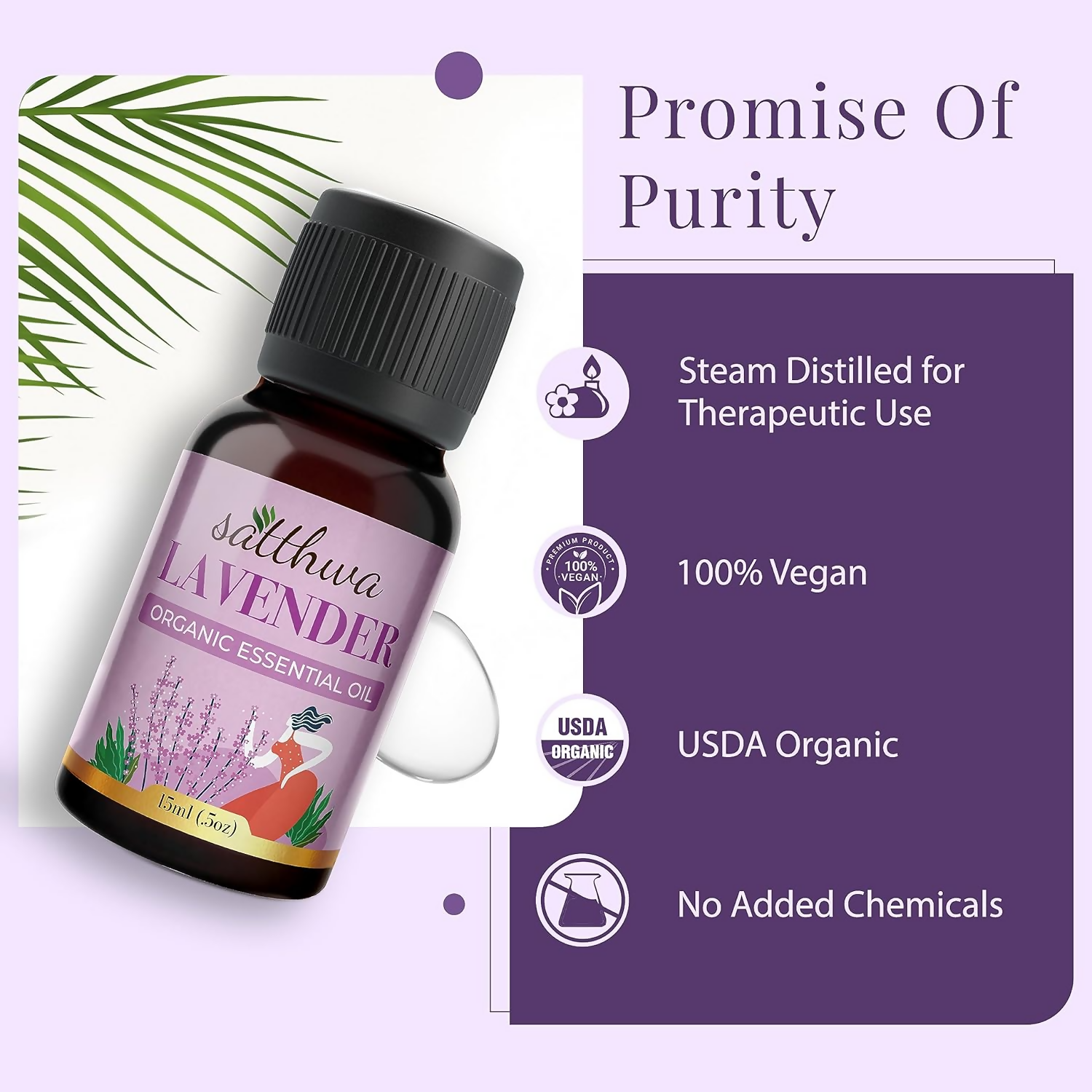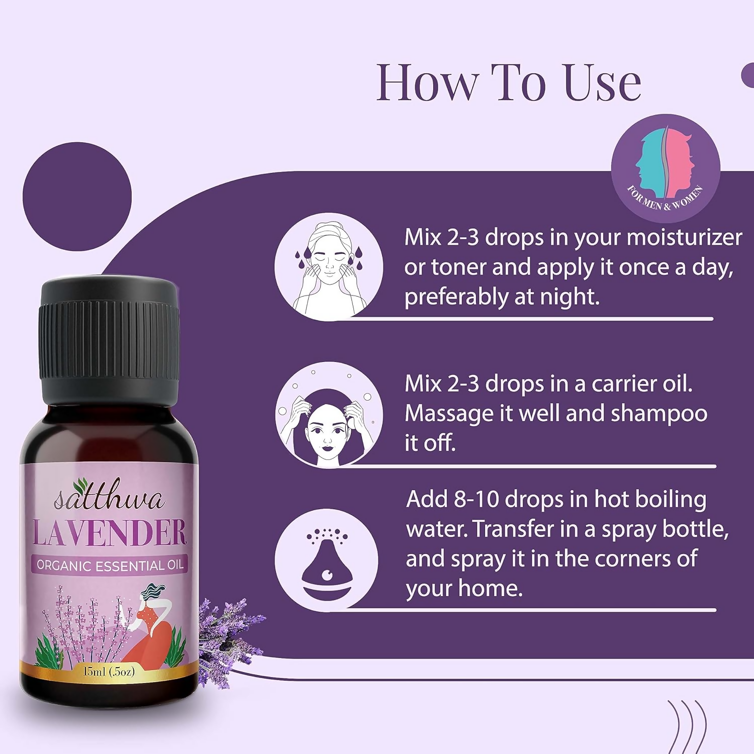 - Certified Organic: Satthwa’s lavender essential oil is both pure and organic. It is obtained through steam distillation from lavender plant flowers, ensuring no chemical usage. Completely free from sulfates, parabens, and additives.