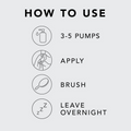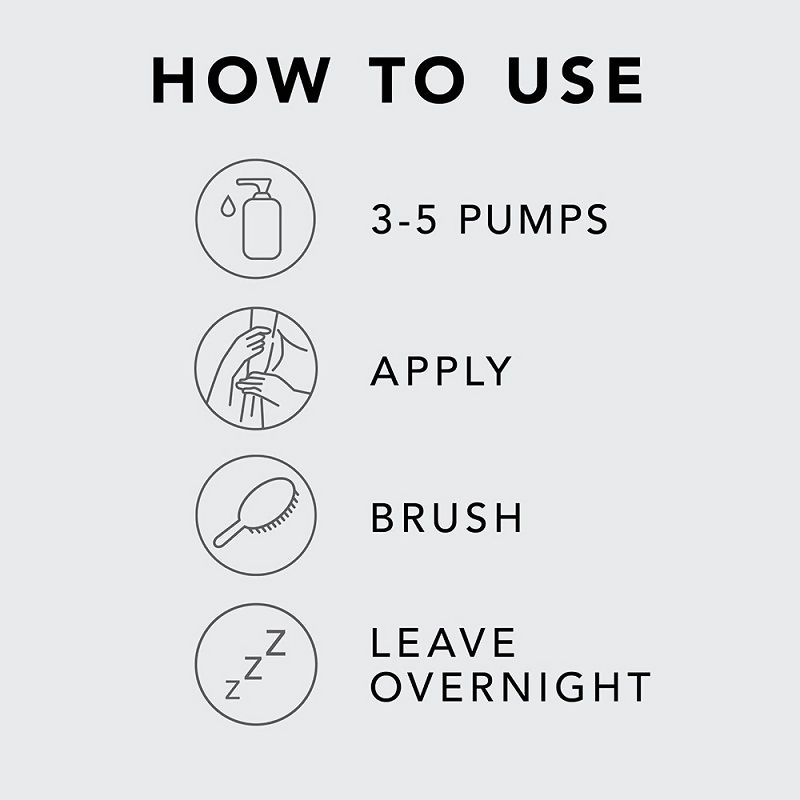 - Dispense 3 to 5 pumps into your palm. Spread uniformly through the hair from the middle to the ends. Comb through and leave it in overnight. Do not wash out—style as normal.