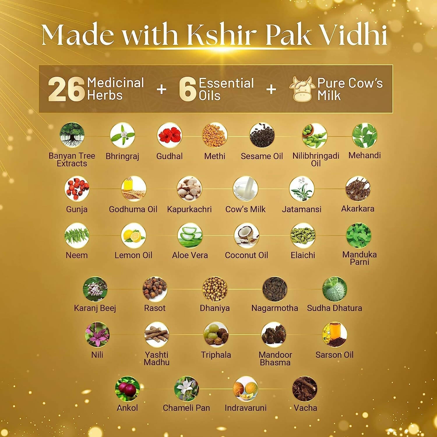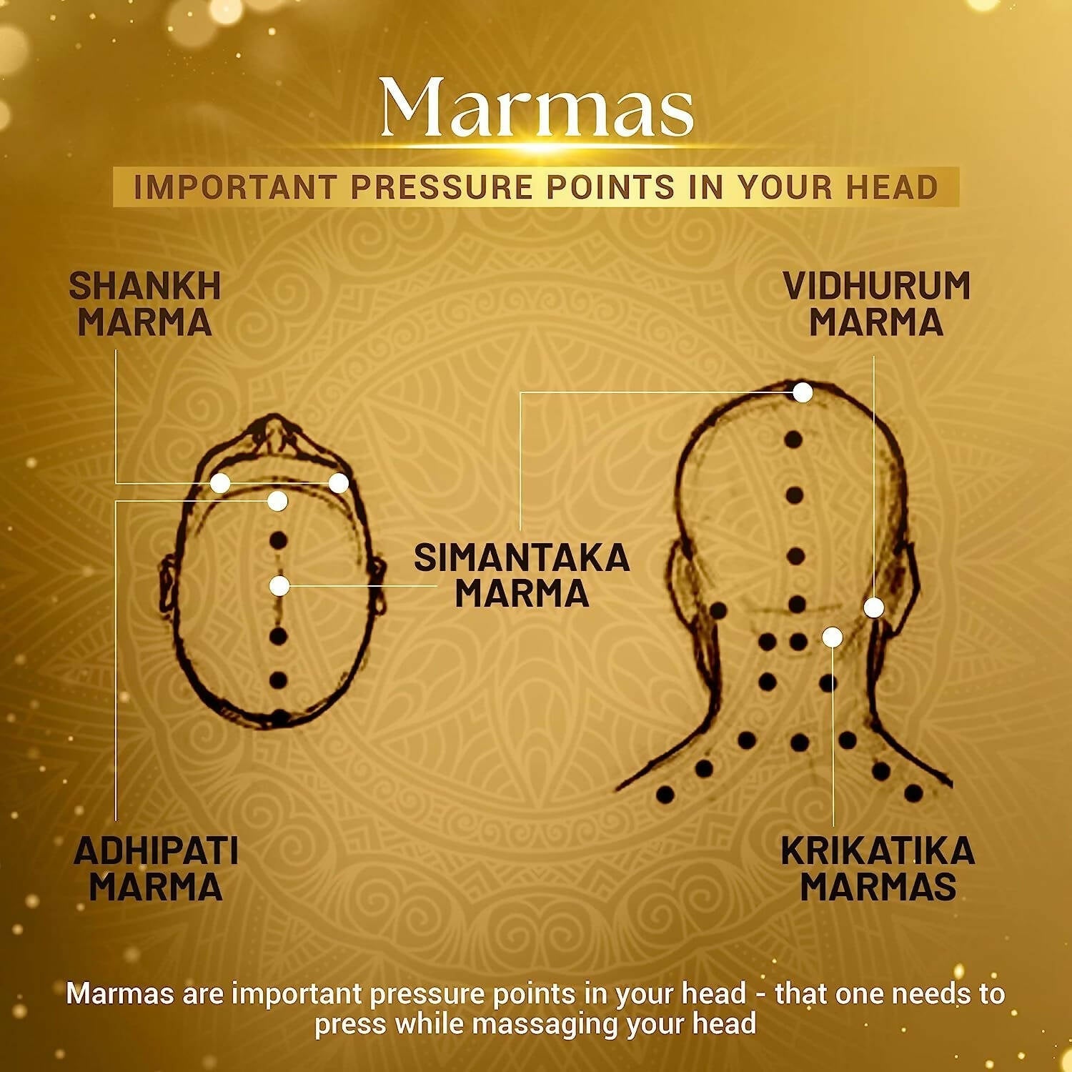 - Step 2: Massage the head: Use the Sesa Udvartana Upakarnam (massager) included in the kit to gently knead your head with small circular movements following Anulom Gati (starting from the scalp and moving along the hair strands). Continue massaging for 5 to 7 minutes on all key marmas (pressure points). Leave on overnight or for 2 hours before rinsing. For optimal results, apply the oil twice weekly for a minimum of 3 months.