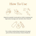 - Apply dry powder to a wet palm, cloth, or sponge and vigorously massage over wet skin, then rinse off