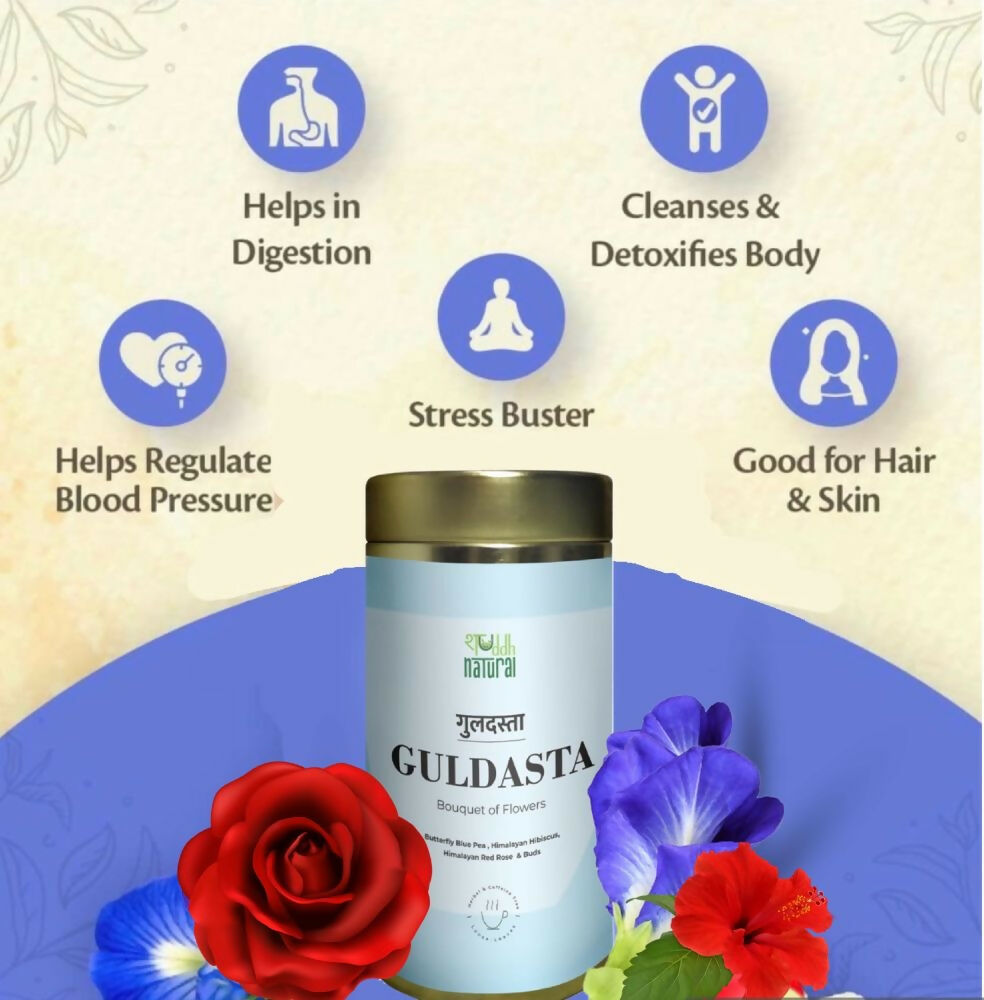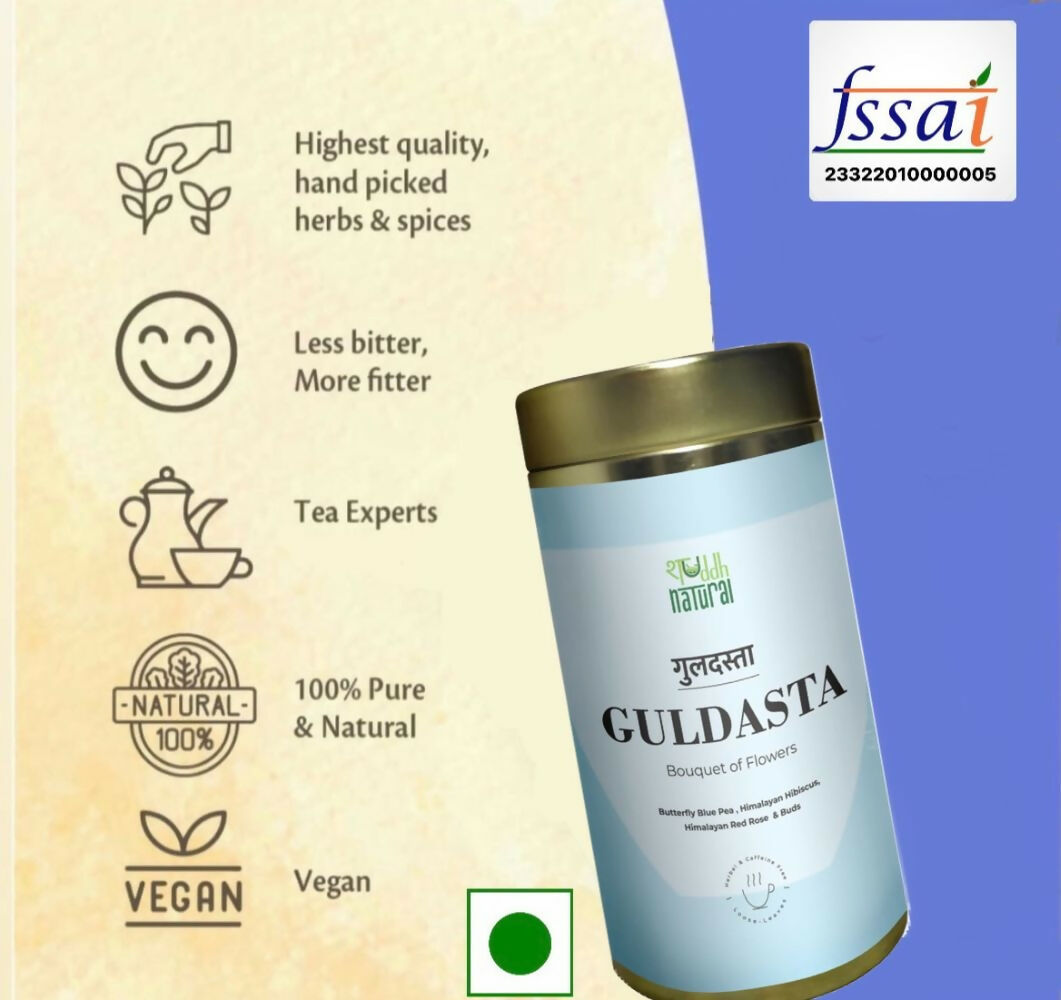 About the Product:- ‘Guldasta’ translates to a Bouquet of Flowers in Hindi. This enchanting, caffeine-free infusion transforms color and offers fruity, floral, and mildly sweet notes. Rich in Ayurvedic benefits, this delightful tea is perfect for any time of day, drawing inspiration from traditional Southeast Asian remedies. This nutrient-rich superfood enhances mood and energy, bolsters the immune system, supports skin renewal, and is packed with powerful antioxidants. Additionally, it is excellent for cognitive function and eye health.