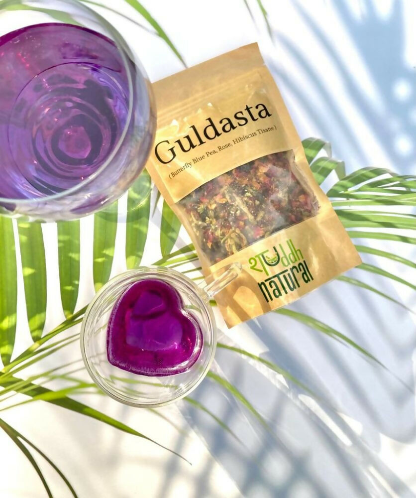 - Add 1gm of Guldasta to 200ml of water heated to 75 – 80°C. Allow it to steep/simmer on a low flame for 3-4 minutes. Add lemon to witness the tea transform to a purple hue. Enjoy it hot or cold.