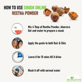 - Moisten your hair and scalp, create a paste with the Reetha / Reeta Powder and apply it onto your hair and scalp, allow it to sit for a few minutes, then rinse off the Kunkudukai powder for a thorough cleanse. A mixture of aavla ritha sikakai powder (hair color powder) is recommended.