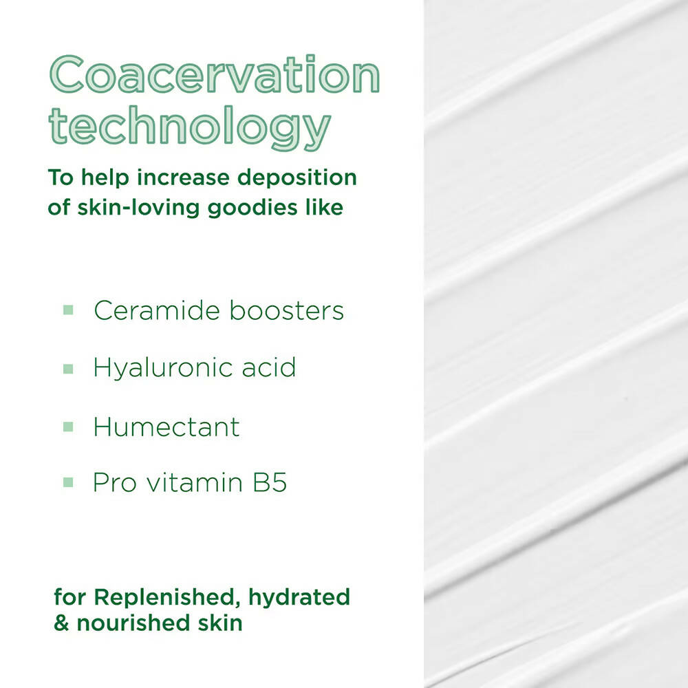 - Crafted with coacervation technology to enhance the delivery of skin-beneficial ingredients such as ceramide enhancers, hyaluronic acid, and provitamin B5, to aid in restoring and maintaining moisture.
