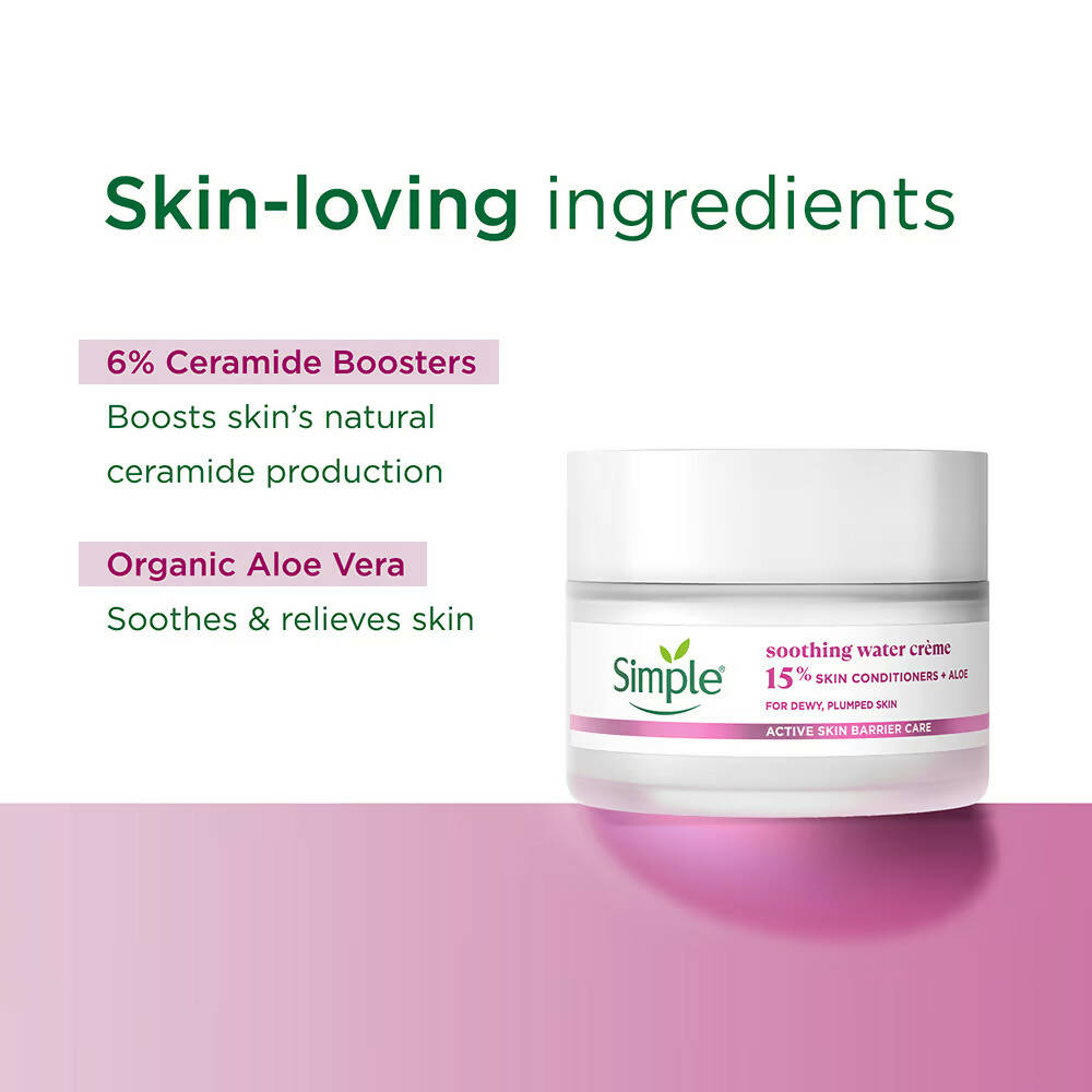 - Simple Active Skin Barrier Care Soothing Water Crème, enriched with 15% skin conditioners and aloe vera, provides calming relief while promoting skin barrier wellness. This crème is a silky, lightweight, and refreshing water-based formula that effortlessly glides onto the skin, reinstating its moisture balance for a soothed and radiant complexion.
