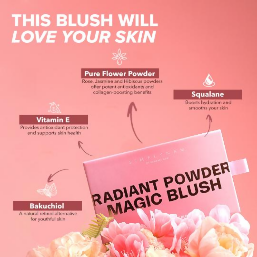 The Radiant Powder Magic Blush seamlessly combines beauty with skincare benefits. Formulated with pure botanical powders such as Hibiscus, Rose, and Jasmine, and infused with Niacinamide and Argan Oil, this blush pampers your skin. Exceptionally long-lasting and free from harmful elements like micro-plastics and talc, it is presented in environmentally conscious packaging. Available in Pink Jasmine (matte) and Rosy Bloom (shimmer) shades, it ensures an effortless glow from morning to evening. Suitable for all skin types.