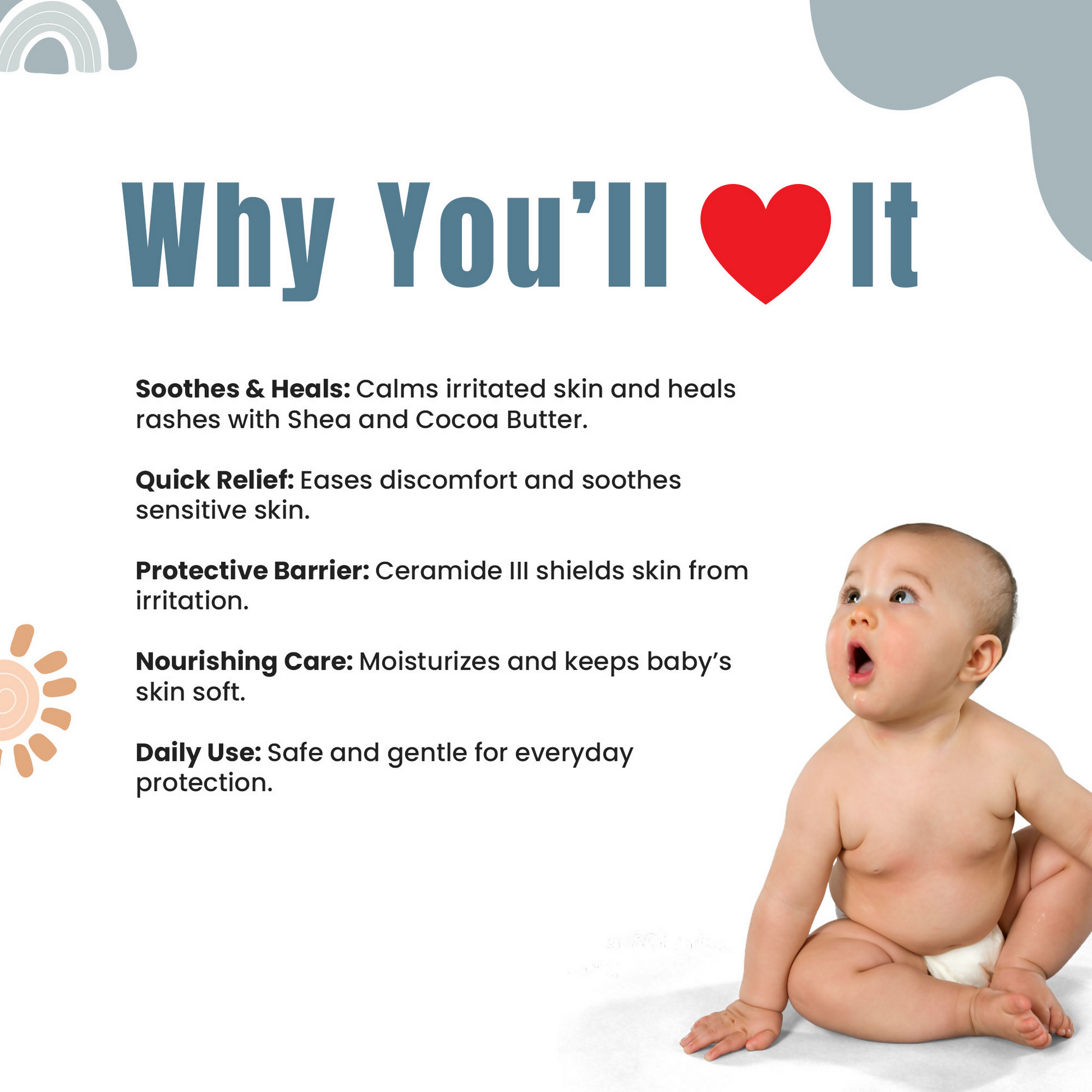 This tender and efficient formulation has been dermatologically tested and is specially crafted for infants, offering vital protection against diaper rashes. Infused with natural components such as cocoa butter, almond oil, and argan oil, it provides calming protection and nourishment to delicate baby skin. Free from sulfates and other harsh chemicals, this sulfate-free product ensures a gentle and safe application, ideal for your baby's sensitive skin.