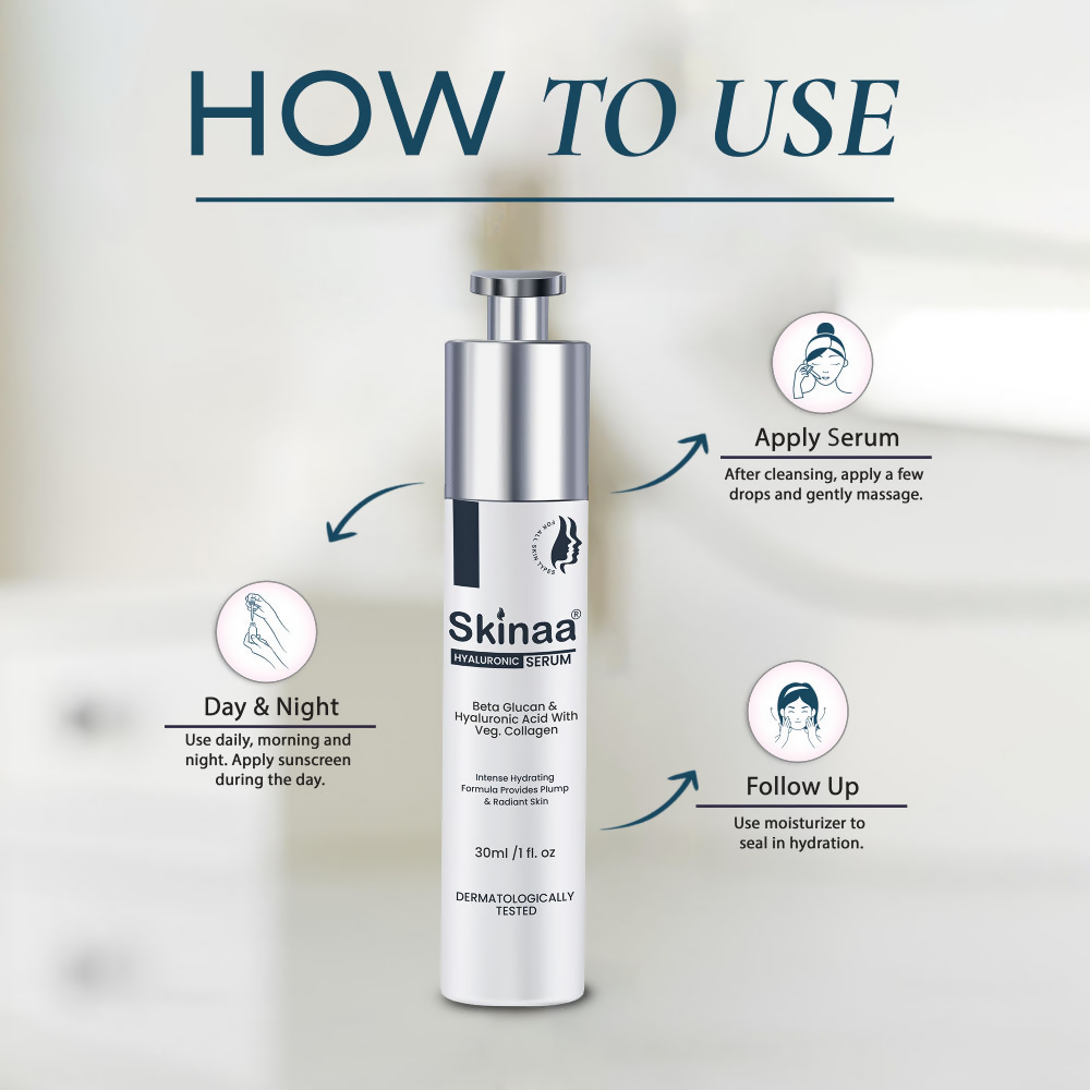 - Dispense 3-4 drops of Skinaa Hyaluronic Acid Serum onto your face and neck, gently massage in circular motions, and allow it to absorb for optimal skin renewal. Steer clear of the eye area, and incorporate it into your daily routine for best results.