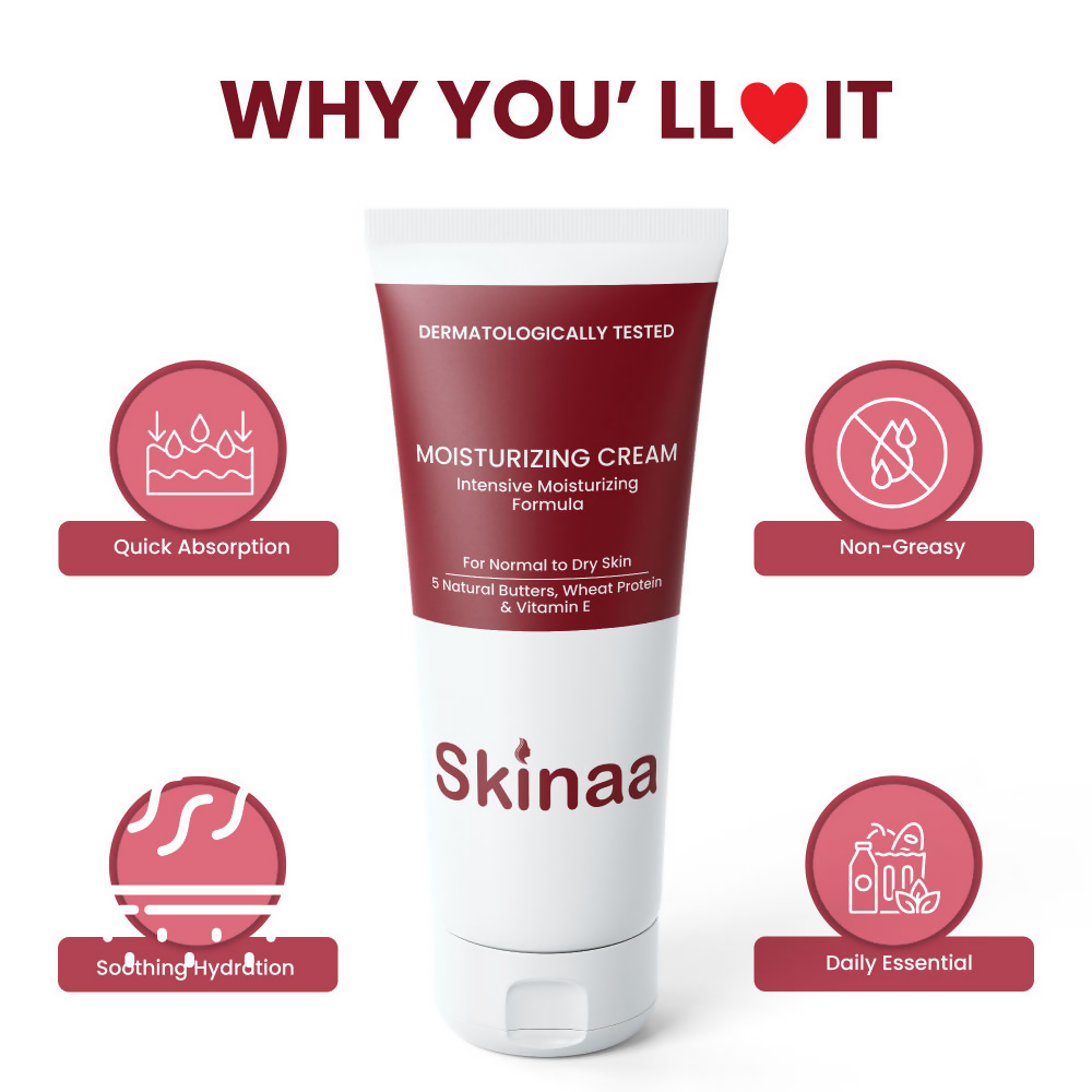 Pamper your skin with the exquisite Skinaa Moisturizing Cream, expertly designed to nourish and rejuvenate dry to normal skin. This sumptuous cream combines the potent hydration of Wheat Protein with the profound moisturization offered by a blend of five natural butters (Shea, Cocoa, Mango Butter, Almond, and Kokum). Wheat Protein aids in moisture retention and enhances skin elasticity, minimizing the appearance of fine lines and promoting a smoother, fuller texture. Vitamin C boosts the skin’s natural glow and helps even out skin tone, while the collection of butters deeply nurtures the skin, ensuring enduring hydration and a soft, supple touch.