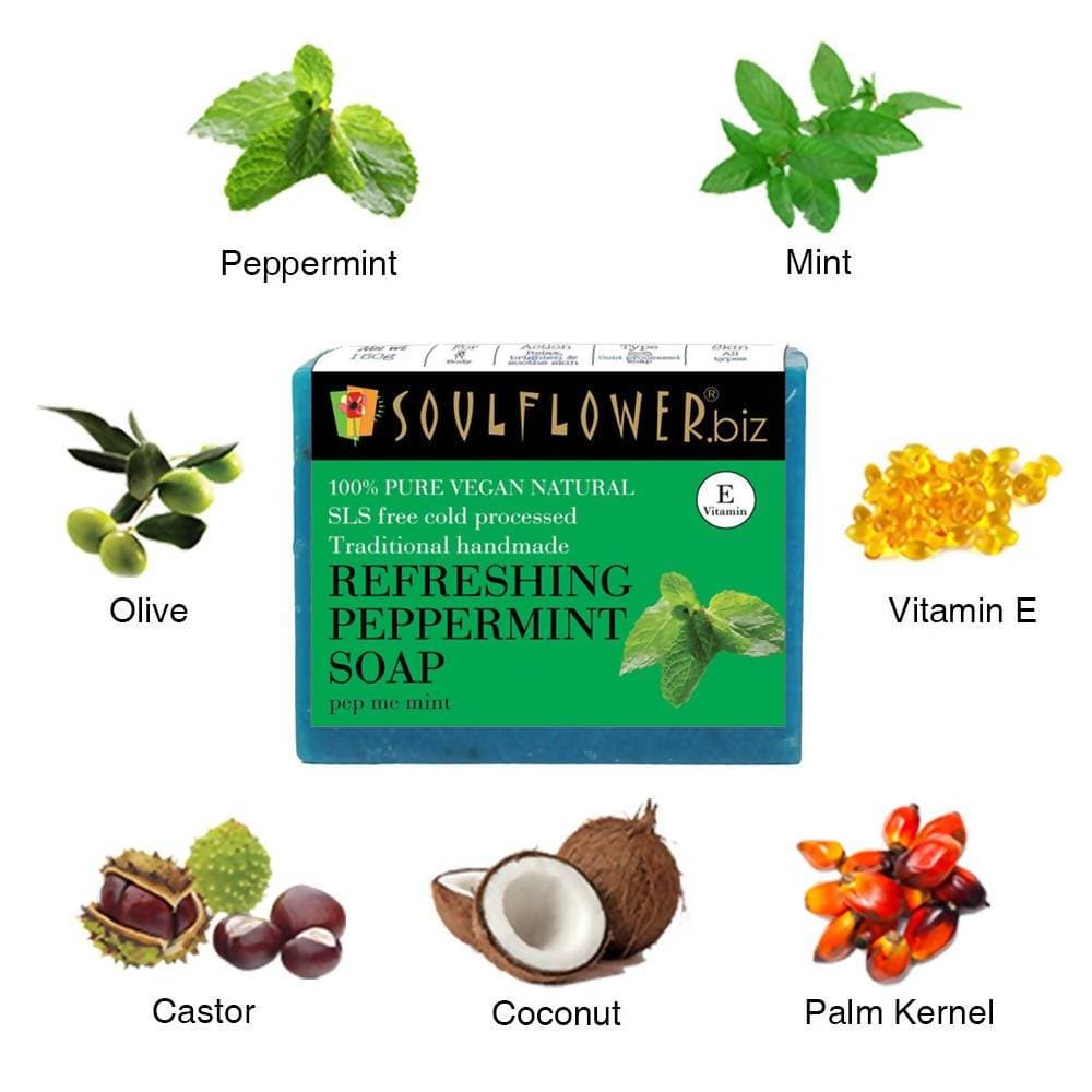 Perfect for every skin type, Soulflower's Refreshing Peppermint Soap is enriched with essential nutrients, making it an ideal treatment for all skin types. It is a safe choice for your skin, being 100% pure, natural, and cold-processed, and free from SLS, chemicals, synthetic colors, or fragrances.