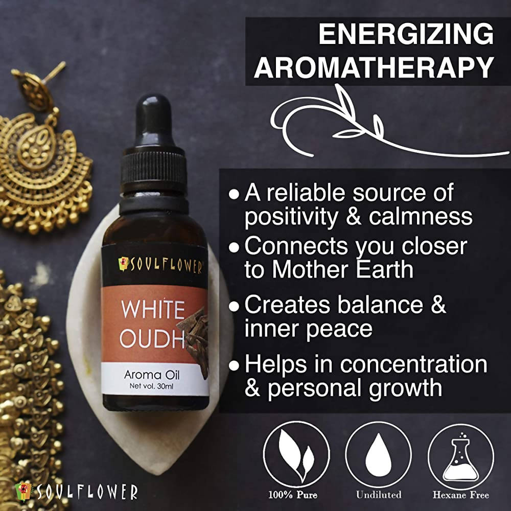 - Diffuse the intricate, balsamic, richly woody scent of Soulflower White Oudh Aroma Oil to elevate the energy and invigorate your environment.