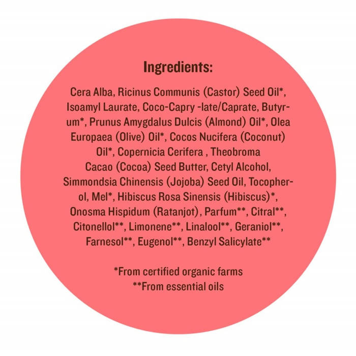 Cacao (Cocoa) Seed Butter, Cetyl Alcohol, Simmondsia Chinensis (Jojoba) Seed Oil, Tocopherol, Mel, Hibiscus Rosa Sinensis (Hibiscus), Onosma Hispidum (Ratanjot), Parfum, Citral, Citronellol, Limonene, Linalool, Geraniol, Farnesol, Eugenol, Benzyl Salicylate.