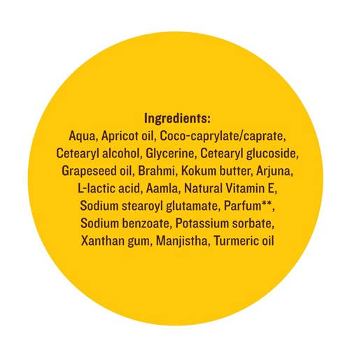 Wrinkle Cream - Turmeric & Aamla with Skin-Firming Brahmi -Aqua, Apricot oil ( or khumani tel), Coco-caprylate/caprate, Cetearyl alcohol, Glycerine, Cetearyl glucoside, Grapeseed oil, Brahmi (or Gotu kola, Mandukaparni) extract, kokum seed butter, Arjuna extract, L-lactic acid, Aamla extract*, Natural Vitamin E (Tocopherol), Sodium stearoyl glutamate, Parfum, Sodium benzoate, Potassium sorbate, Xanthan gum, Rubia cordifolia Manjistha extract, Turmeric oil, Linalool, Limonene, Citronellol, Geraniol, Benzyl alcohol, Benzyl cinnamate, Citral, Eugenol, Farnesol