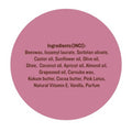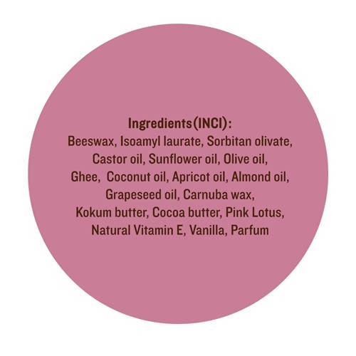 Cera alba (beeswax), Isoamyl laurate, Ricinus communis (castor) oil, Helianthus annus (sunflower) oil, Sorbitan olivate, Olea europaea (olive) oil, Butyrum (clarified butter), Cocos nucifera (coconut) oil, Prunus armeniaca (apricot) oil, Prunus dulcis (almond) oil, Vitis vinifera (grapeseed) oil, Garcinia indica (kokum) butter, Theobroma cacao (cocoa) butter, Tocopherol, Viola odorata (neelpushpa), Vanilla plantifolia, Parfum, CI 77891, CI77742, CI 77492, Limonene, Linalool, Geraniol, Citronellol.