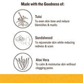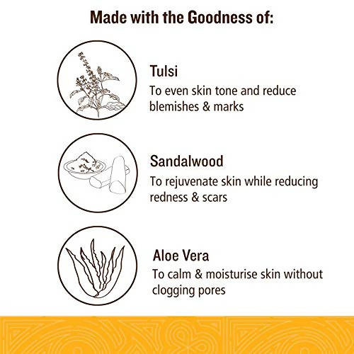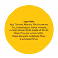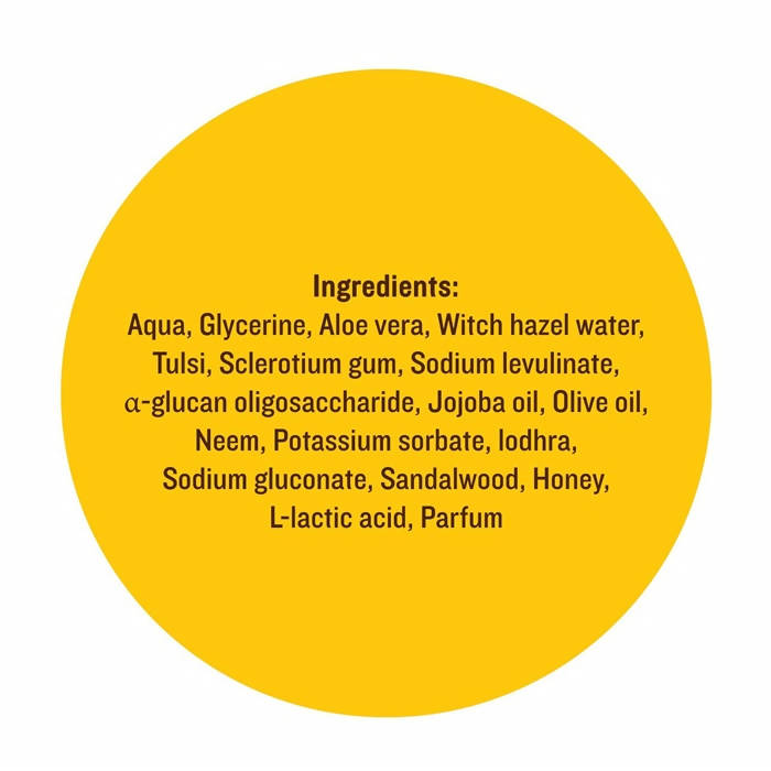 Aqua, Glycerine, Aloe barbadensis leaf (aloe vera) juice, Hamamelis virginiana (witch hazel) water, Ocimum sanctum (tulsi) infusion, Sclerotium gum, Sodium levulinate, α-glucan oligosaccharide, Simmondsia chinensis (jojoba) seed oil, Olea europaea (olive) fruit oil, Azadirachta indica (neem) infusion, Potassium sorbate, Symplocos racemosa (lodhra) infusion, Sodium gluconate, Santalum album (sandalwood) extract, Mel (honey), L-lactic acid, Parfum, Limonene, Linalool, Eugenol, Geraniol, Citronello.