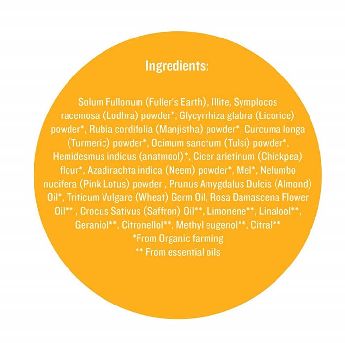 Solum Fullonum (Fuller's Earth), Illite, Symplocos racemosa (Lodhra) powder, Glycyrrhiza glabra (Licorice) powder, Rubia cordifolia (Manjistha) powder, Curcuma longa (Turmeric) powder, Ocimum sanctum (Tulsi) powder, Hemidesmus indicus (anatmool), Cicer arietinum (Chickpea) flour, Azadirachta indica (Neem) powder, Mel, Nelumbo nucifera (Pink Lotus) powder, Prunus Amygdalus Dulcis (Almond) Oil, Triticum Vulgare (Wheat) Germ Oil, Rosa Damascena Flower Oil, Crocus Sativus (Saffron) Oil, Limonene, Linalool, Geraniol, Citronellol, Methyl eugenol, Citral.