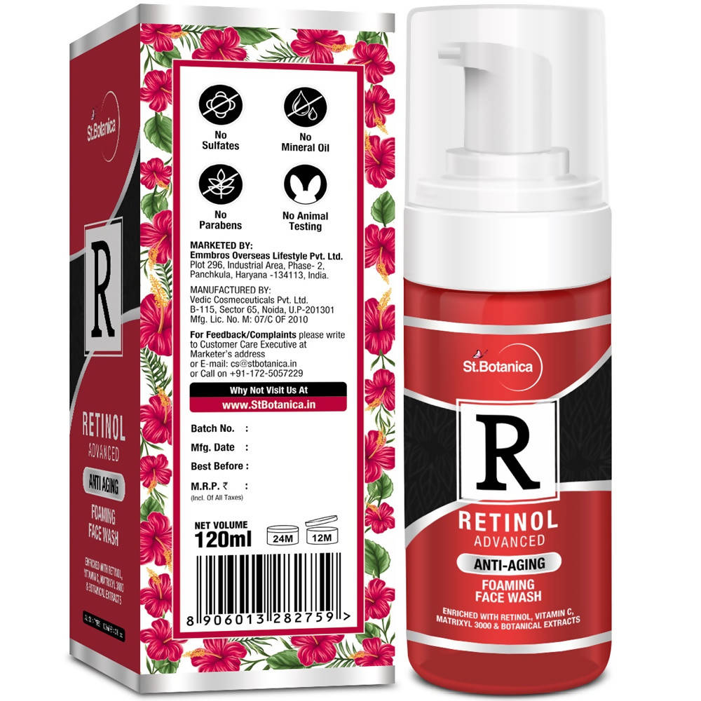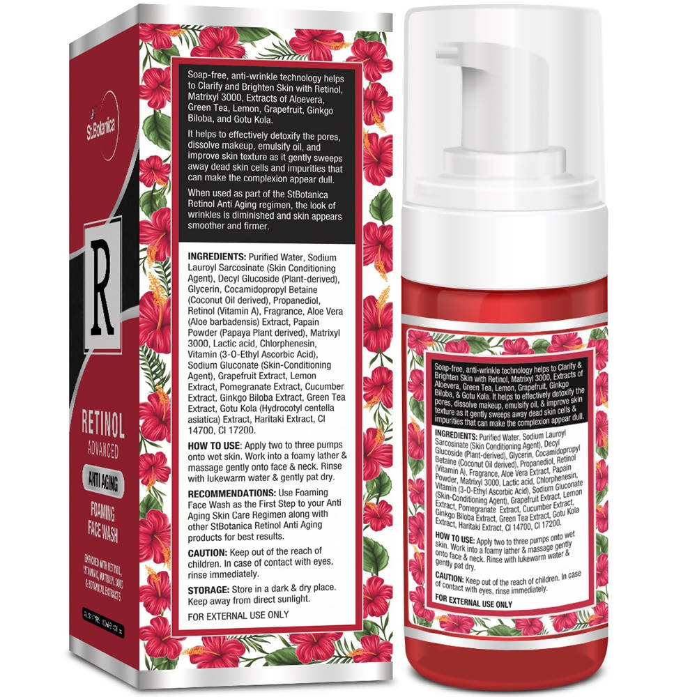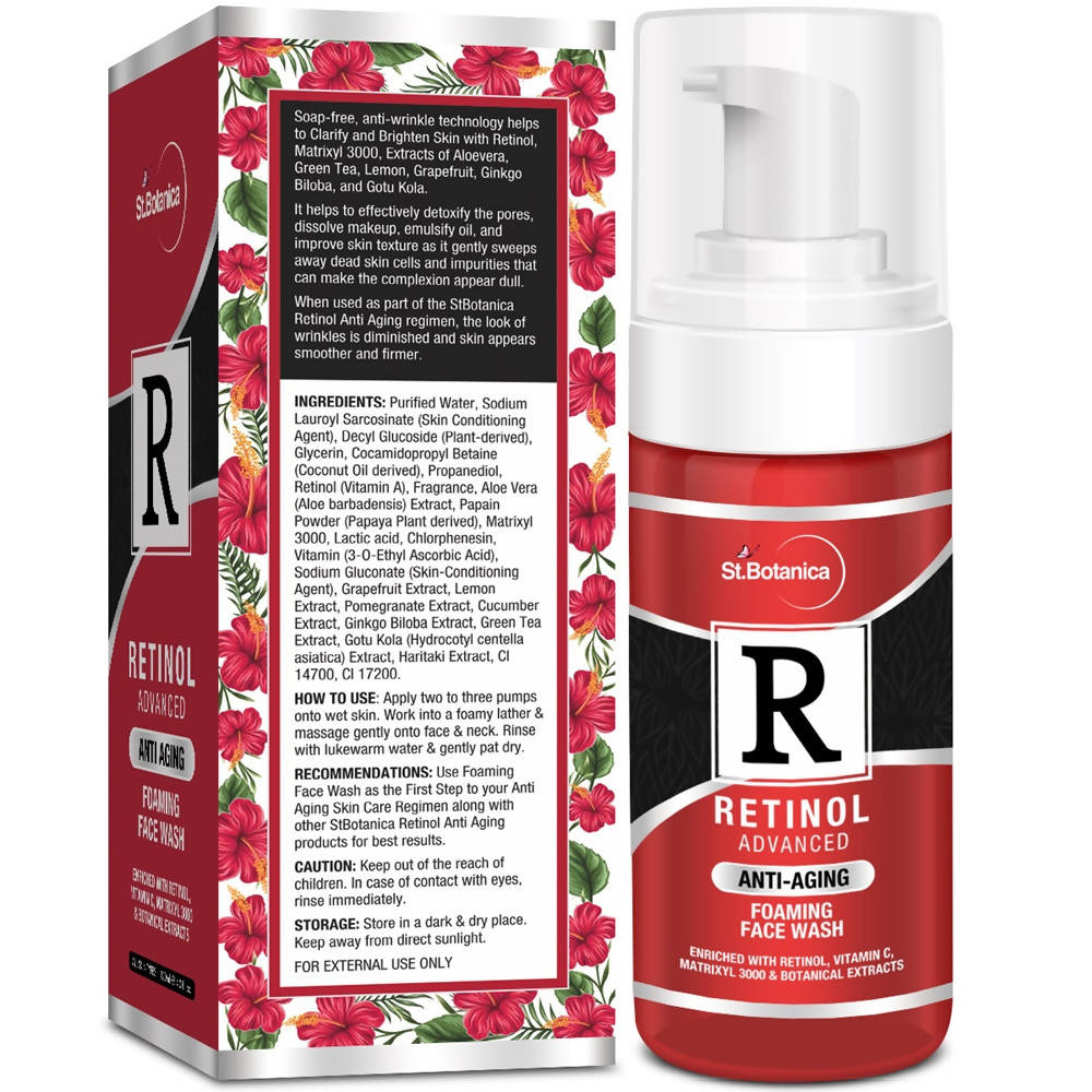 - Dispense two to three pumps of the face wash onto moistened skin. Create a rich lather and gently massage onto the face and neck. Rinse with lukewarm water and pat dry. Follow with St.Botanica Retinol Advanced Anti Aging Face Mist and Retinol Advanced Anti Aging Day Cream for optimal results.