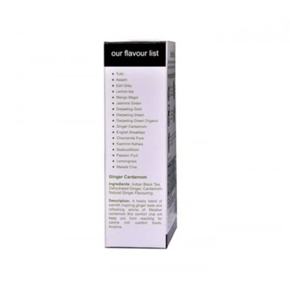 - Indian Black Tea, Dehydrated Ginger, Cardamom, Natural Ginger Flavoring.