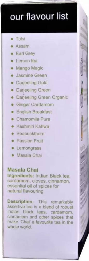 - Indian Black tea, cardamom, cloves, cinnamon, essential oil of spices for natural flavoring.