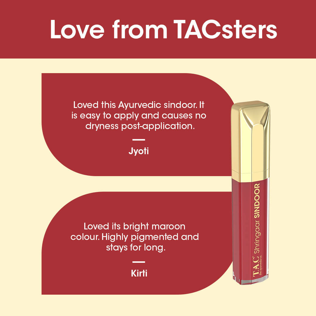 - T.A.C Liquid Sindoor is conveniently portable, allowing you to carry it in your handbag or pocket to elevate your elegance.