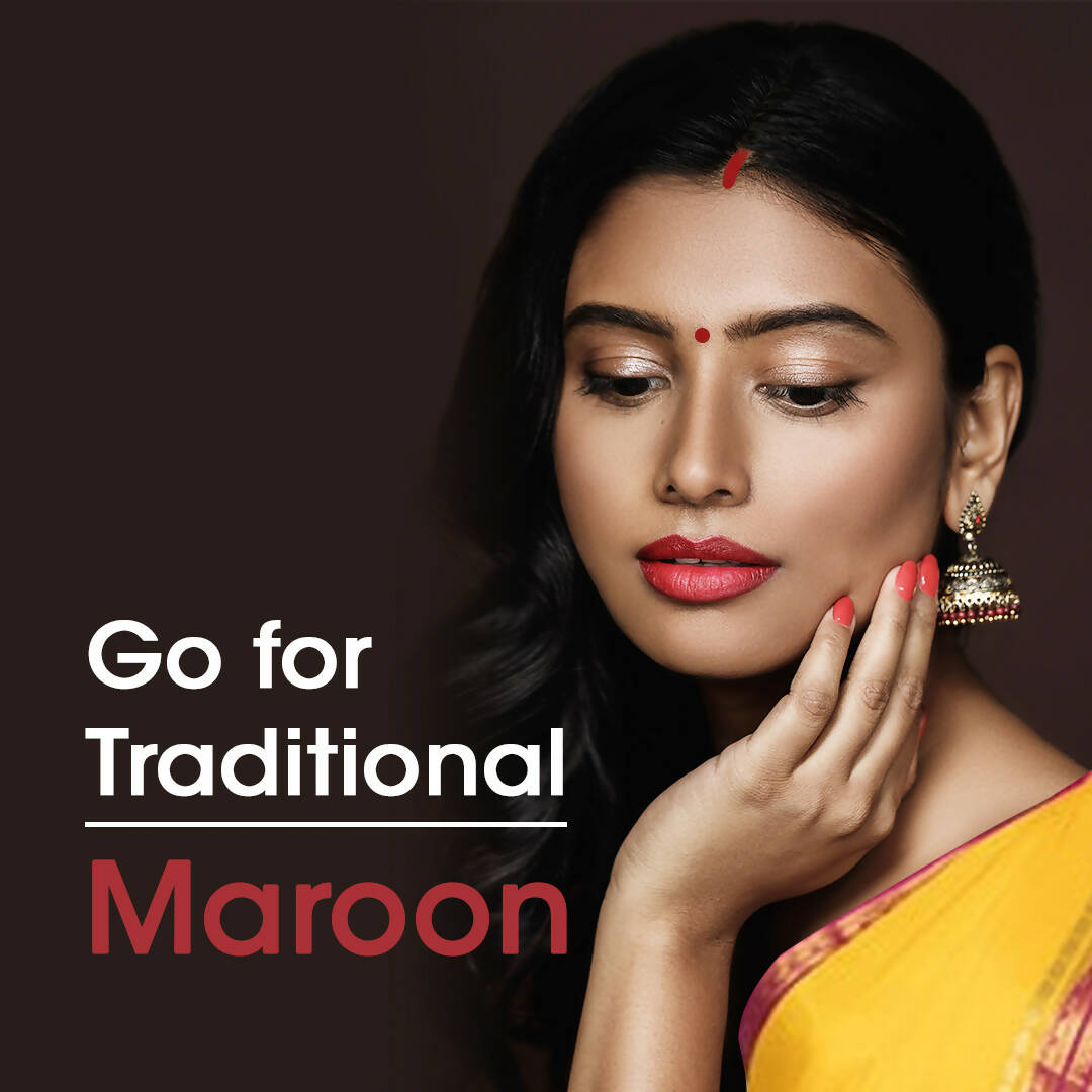 - The smudge-resistant Sindoor is equipped with a precise applicator brush, ensuring an easy and mess-free application. It delivers a vibrant maroon hue, remains intact for extended periods, and requires no touch-ups.