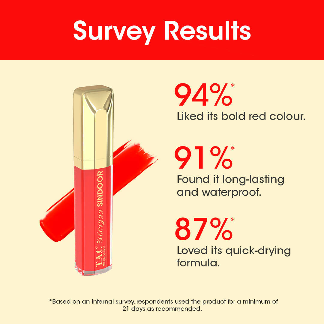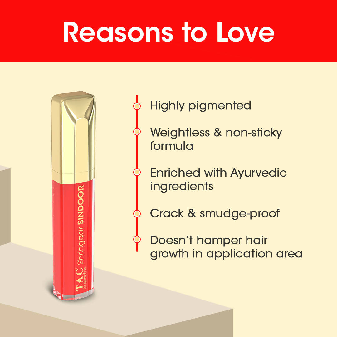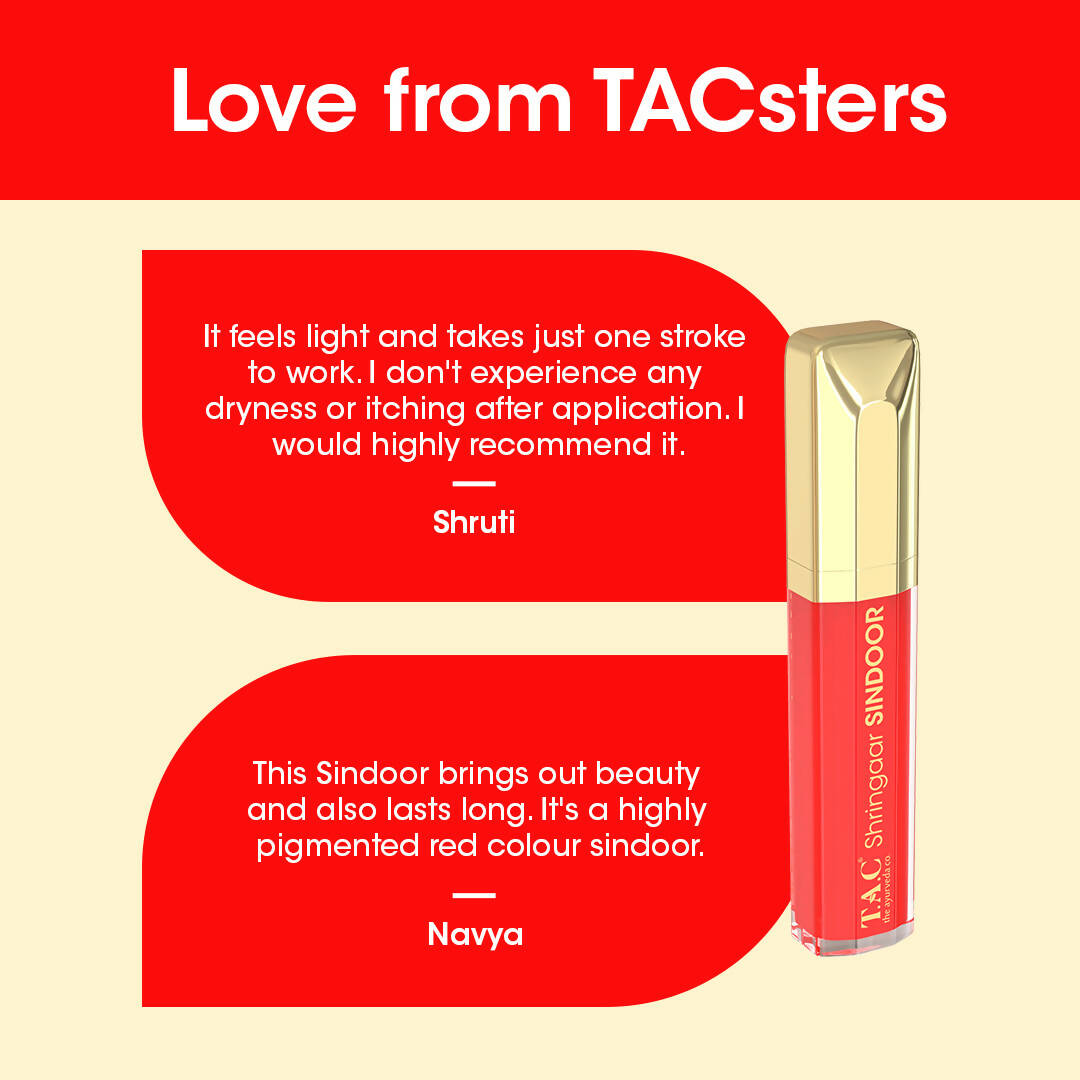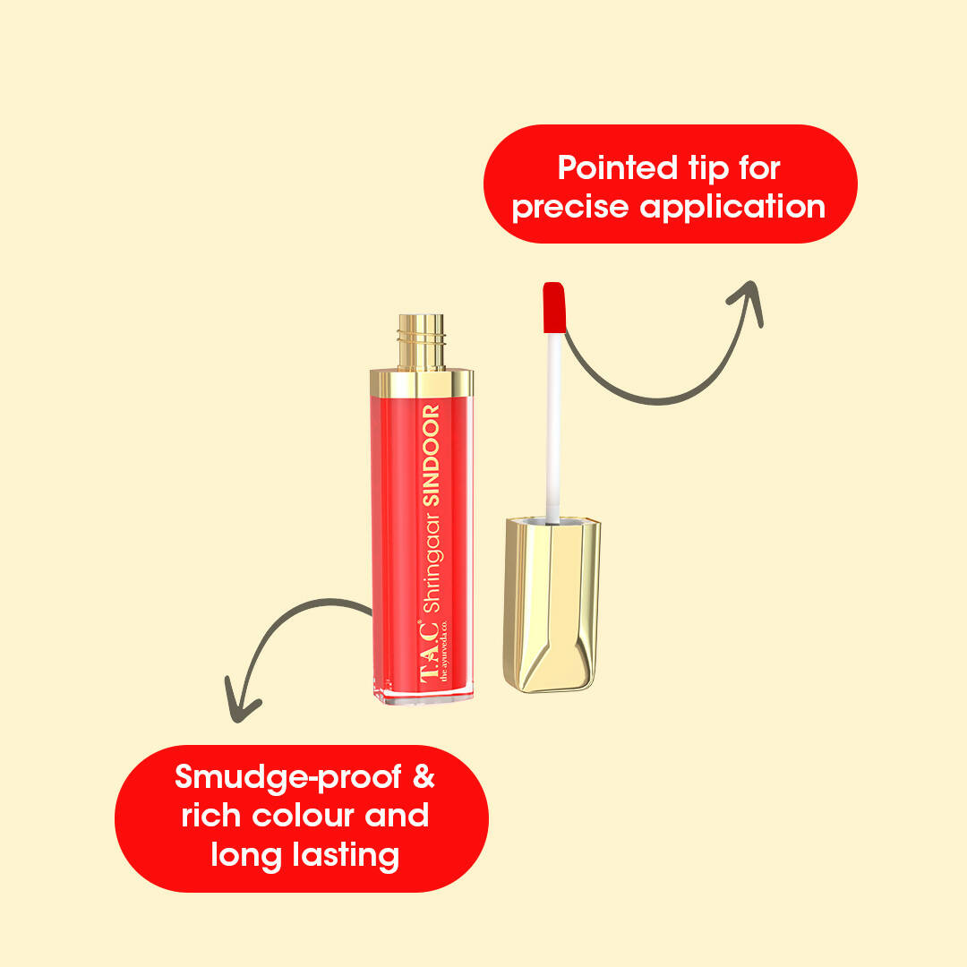- It delivers a vivid red hue, remains intact for extended hours, and requires no touch-up. T.A.C Liquid Sindoor is budget-friendly, making it convenient to carry in your handbag or pocket to elevate your elegance.