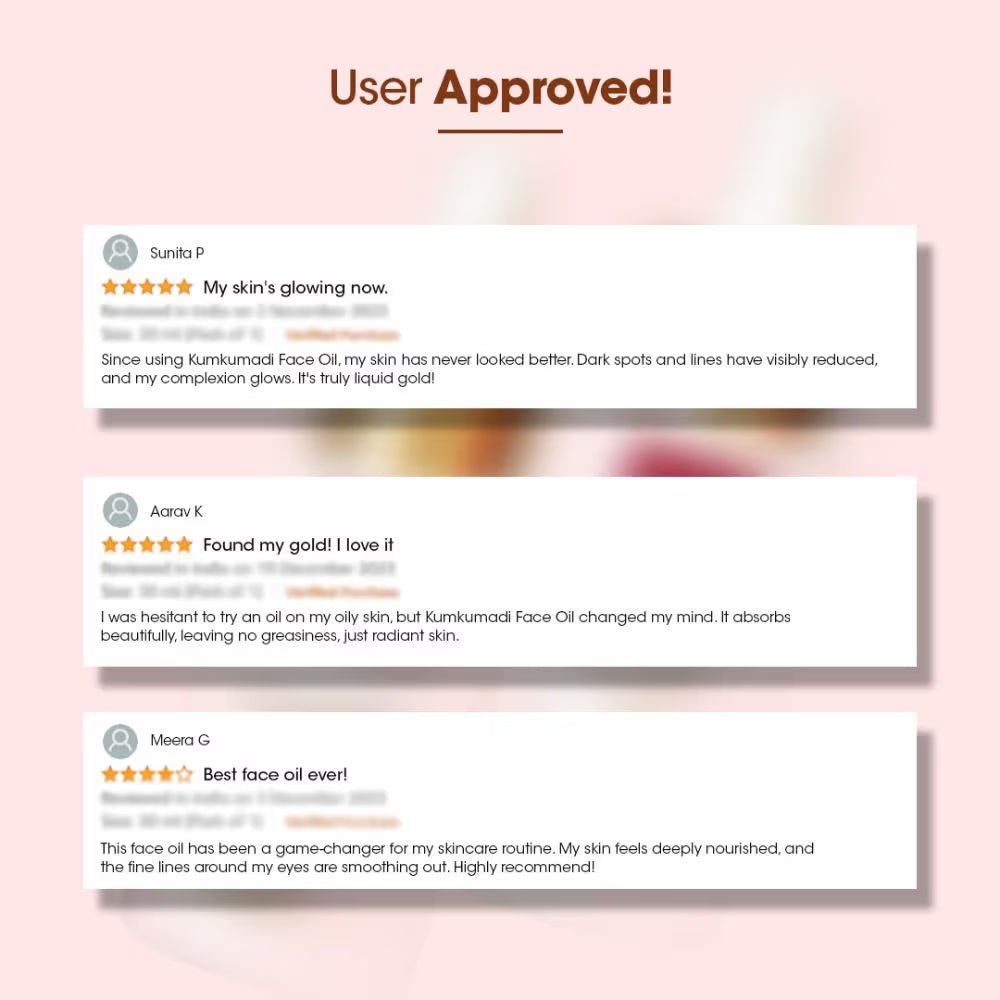 - This Kumkumadi Face Oil, designed for luminous skin, is infused with the richness of Saffron, Goat Milk, Rose Water, and more, aiding in diminishing dark spots and enhancing hydration levels, leaving skin soft, supple, and naturally radiant.