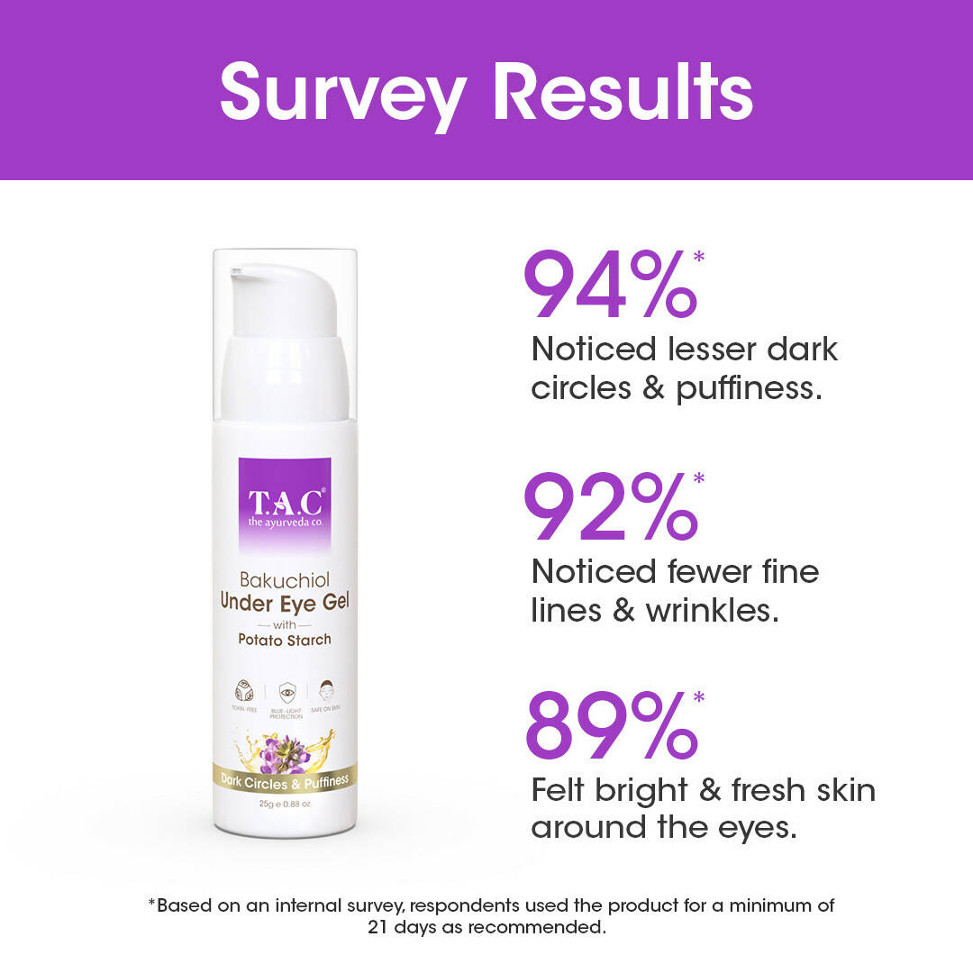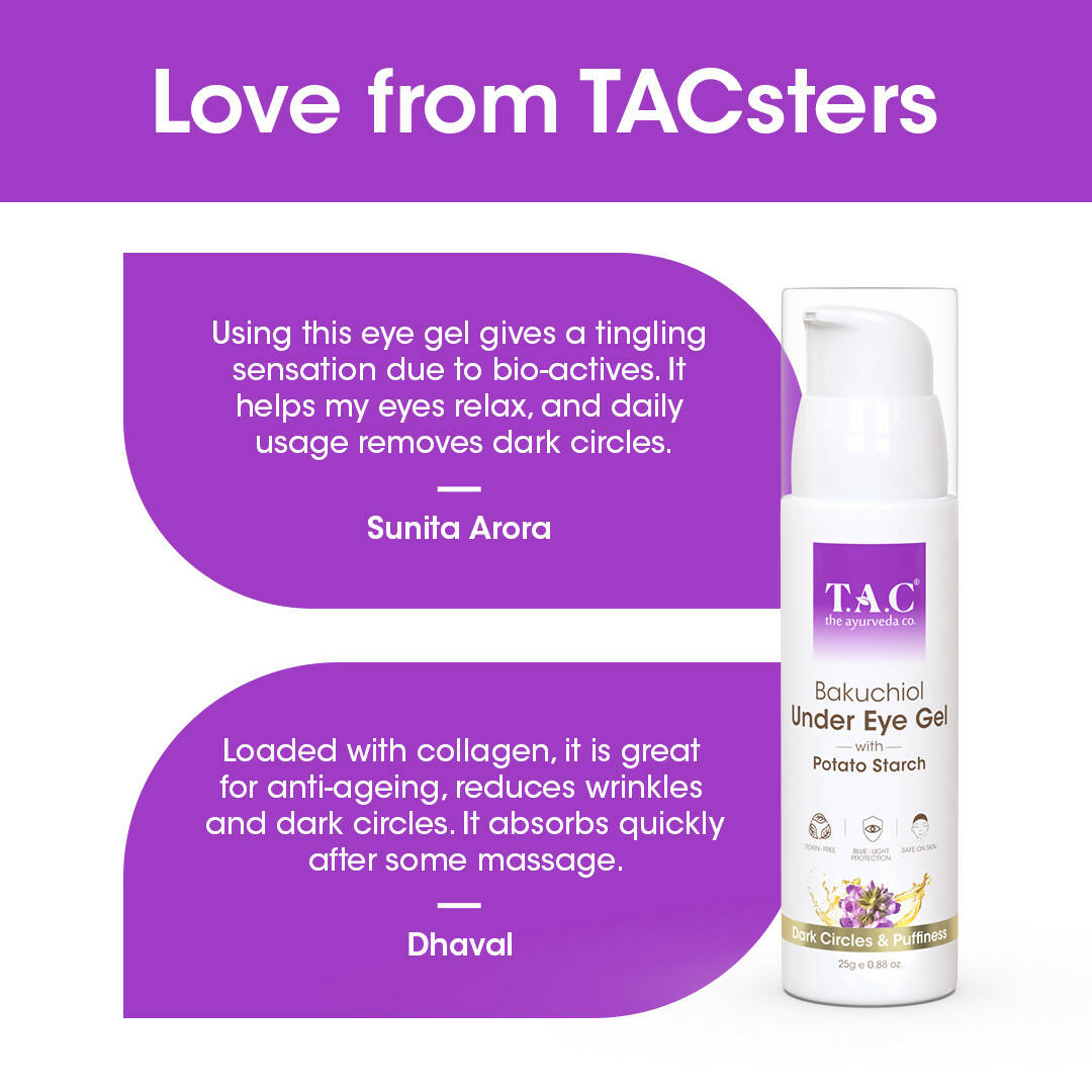 - T.A.C Bakuchiol Under Eye Gel with Potato Starch is expertly formulated to illuminate and reduce puffiness in your delicate under-eye regions. Enriched with Potato Starch and Babchi, it aids in lightening and brightening dark under-eye zones.