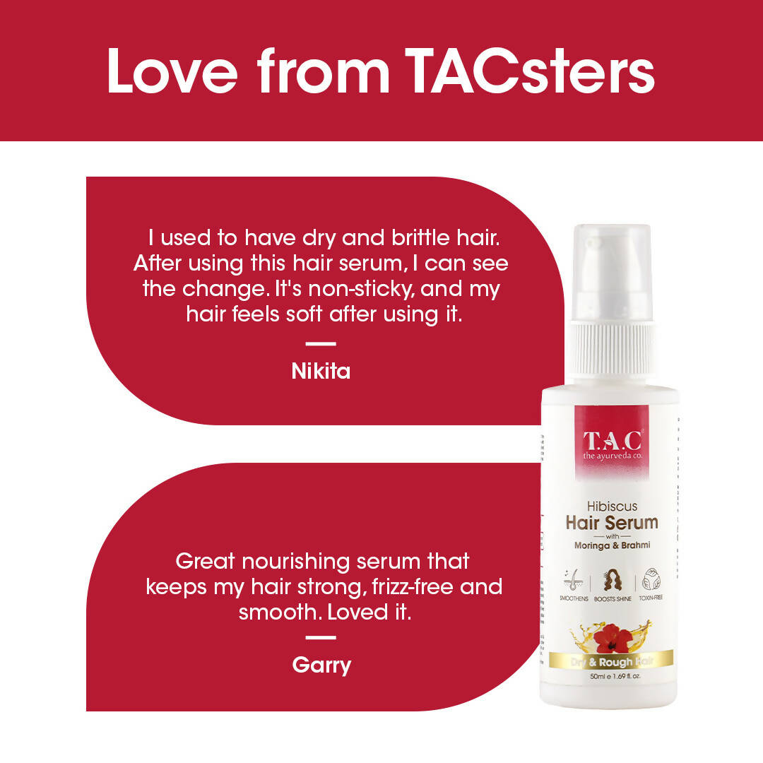 About Product:- Revitalize and infuse vitality into lackluster and lifeless hair with T.A.C Hibiscus Hair Serum featuring Moringa & Brahmi.