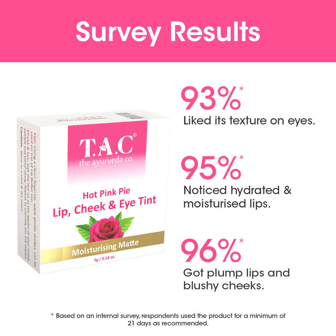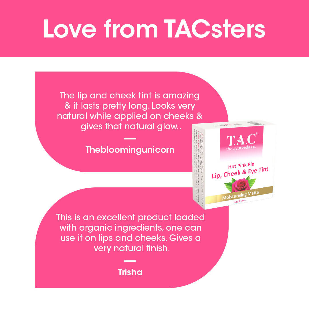 - T.A.C Hot Pink Pie Lip, Cheek & Eye Tint is a traditional blend of potent botanicals and fruit extracts that enhances your lips with a fuller look, adds a rosy hue to your cheeks, and provides a unified tone to your eyes.