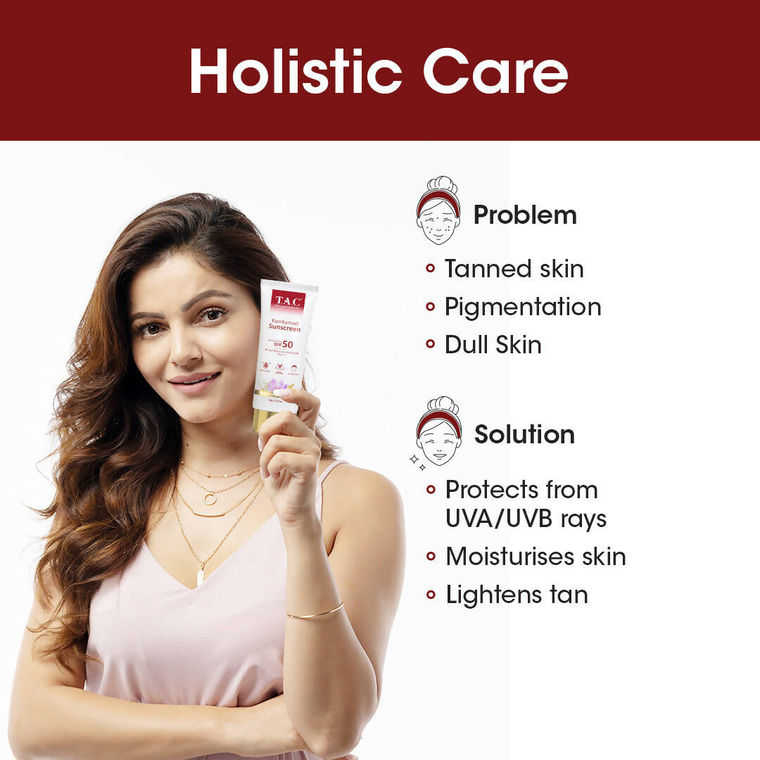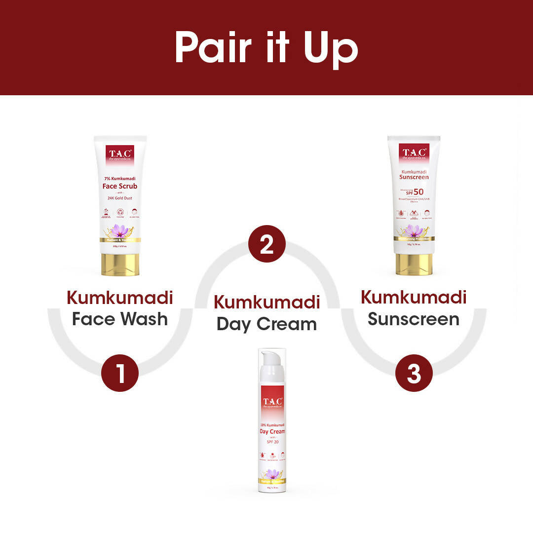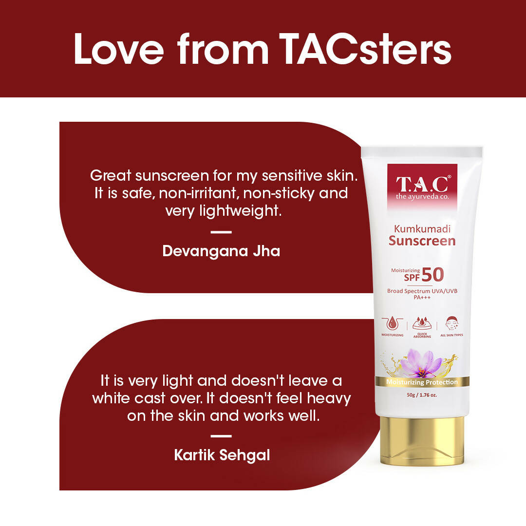 - Shield your skin from the sun's detrimental UV rays with T.A.C Kumkumadi Sunscreen, offering SPF 50 PA+++ comprehensive protection.
