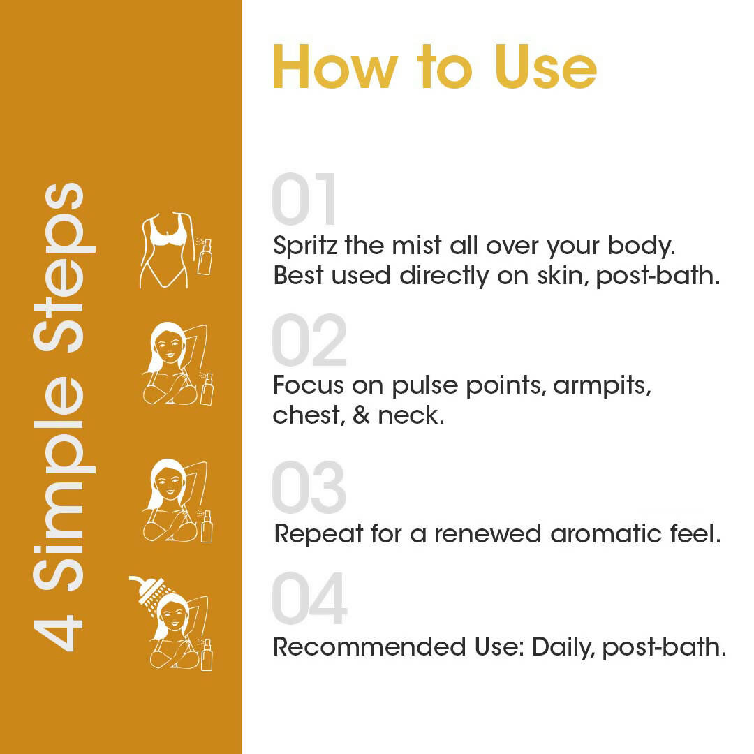 - The gentle and soothing aroma of the Body Mist is ideal for those who prefer subtle fragrances.