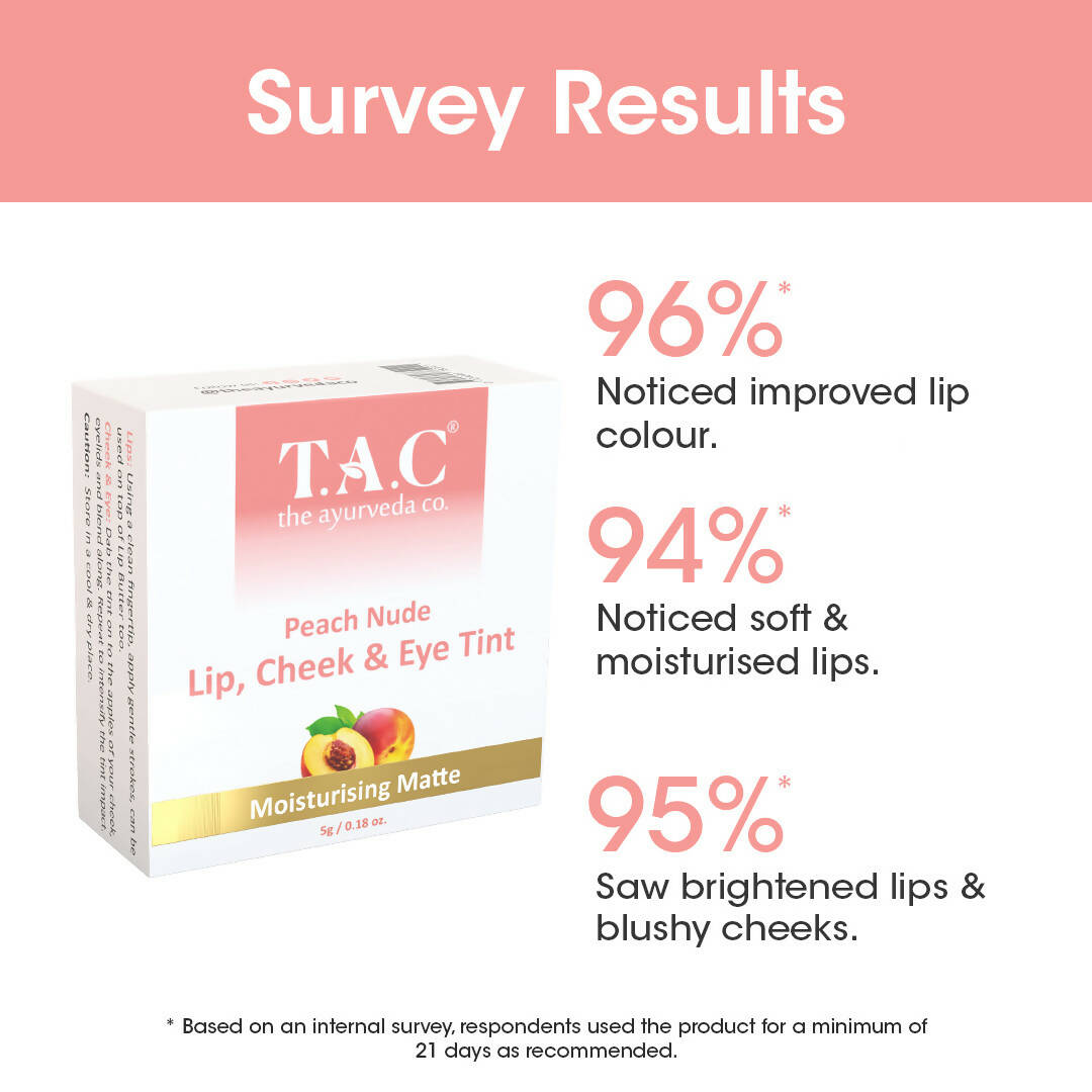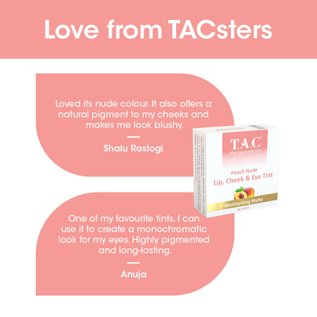 - The T.A.C Peach Nude Lip, Cheek & Eye Tint is a herbal blend of potent botanicals and fruit extracts that enhances your lips with a fuller look, adds a rosy hue to your cheeks, and provides a unified tone to your eyes.