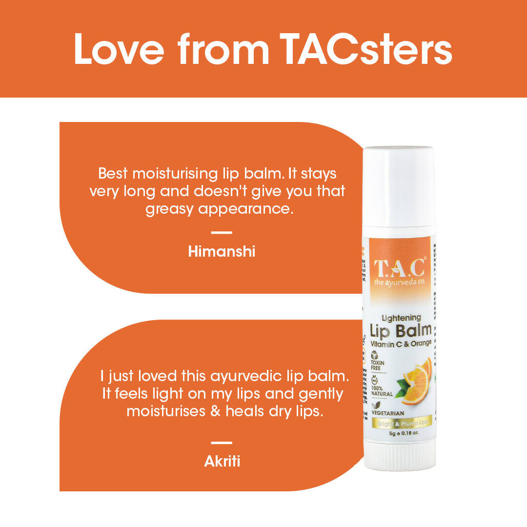 - Revitalize them with T.A.C Lightening Lip Balm to achieve a smooth, soft, and plump appearance. This lip balm is free from harmful chemicals and crafted with natural and ayurvedic extracts and oils, ensuring it is safe for all skin types.