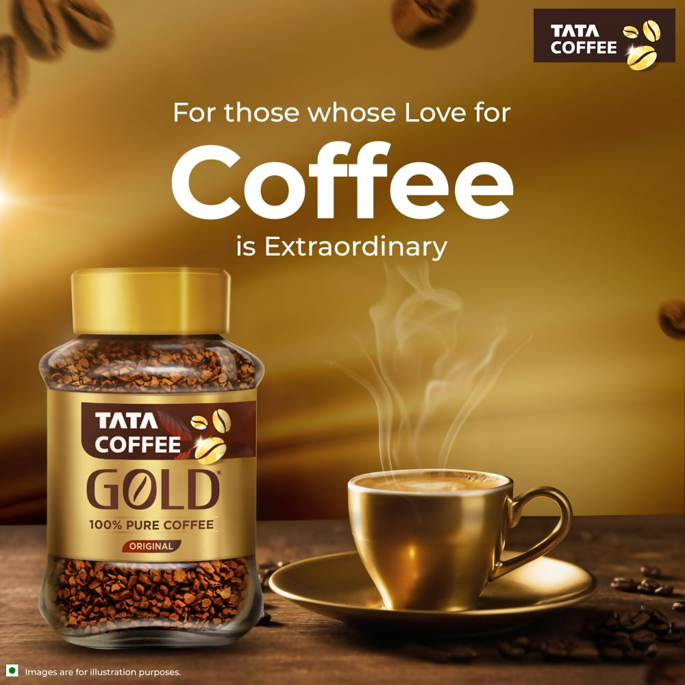 About the Product:- For coffee enthusiasts with a profound appreciation for flavor, Tata Coffee Gold offers an exceptional instant coffee experience. This remarkable blend is meticulously crafted from handpicked Robusta and Arabica beans. Each granule of Tata Gold instant coffee is freeze-dried to encapsulate the rich, robust flavor and the enchanting aroma of 100% pure coffee. Relish a cup that's delightful to the very last drop.
