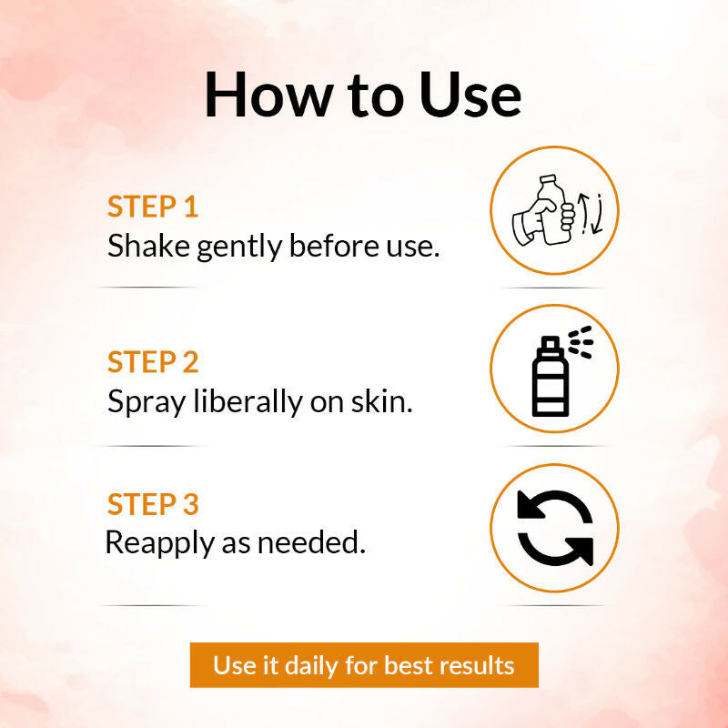 - Position the bottle 4-6 inches from the skin and spray uniformly.