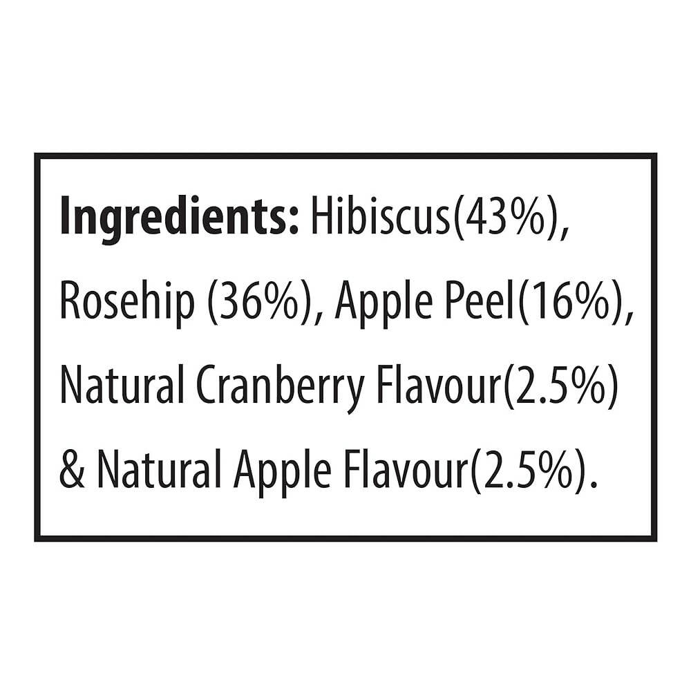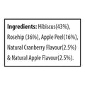 - Natural Cranberry Flavor(2.5%), Apple Peel(16%), Rosehip(36%), Hibiscus(43%), Natural Apple Flavor (2.5%)