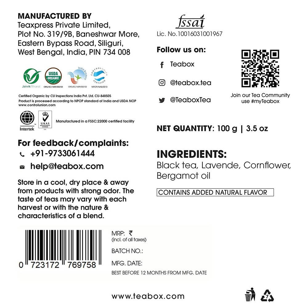 Ingredients:- Black Tea, Cornflower, Bergamot Oil and Lavender