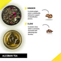 Teacurry Alcoban Tea Bags contain an herbal blend featuring Penang cloves, cassia cinnamon, peppermint, ginger, turmeric curcumin longa, chamomile flowers, Himalayan nettle, fennel, fenugreek, and Thymus serpyllum Linn. These ingredients are sourced from various regions and combined to create a unique herbal tea infusion.