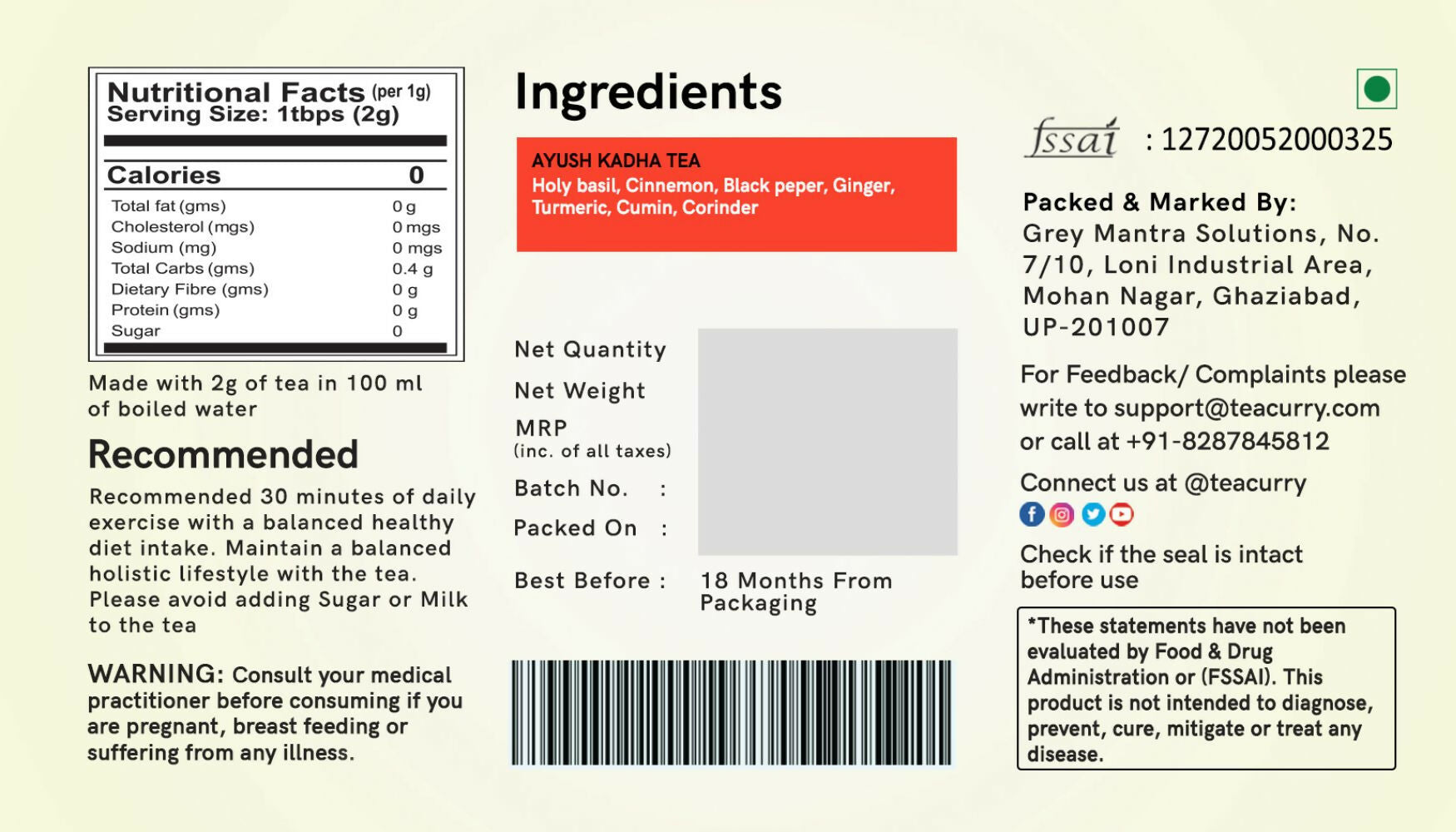 Ingredients:Teacurry Kadha Tea is composed of Holy basil, ginger, cinnamon, black pepper, turmeric, and coriander.