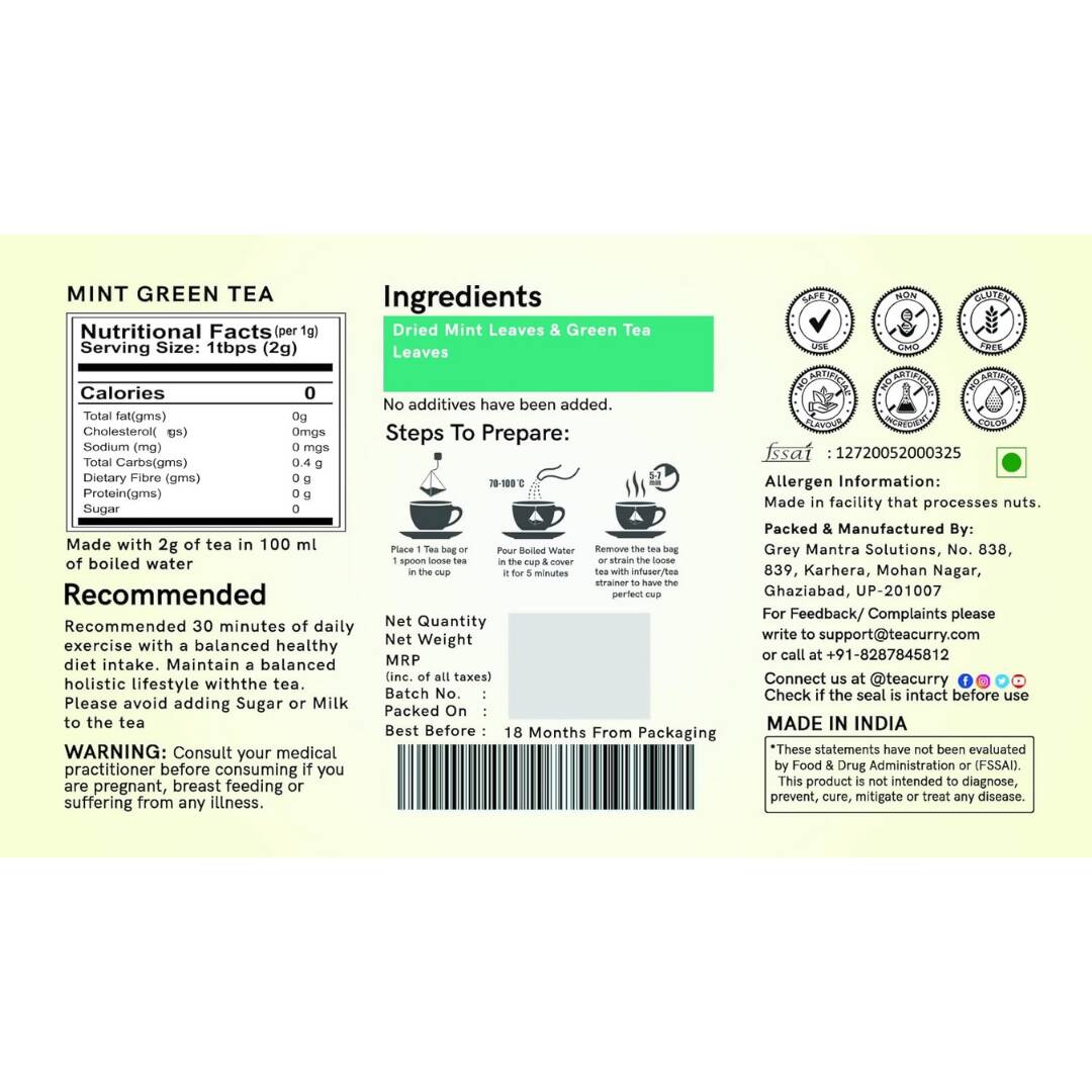Teacurry Mint Green Tea presents an exquisite fusion of green tea, featuring pure mint leaves derived from the Mentha Arvensis variety, cultivated in the lush fields of Punjab, and premium Green tea leaves sourced from Assam. Carefully selected from India’s premier gardens and skillfully crafted by our expert blenders through countless trials.