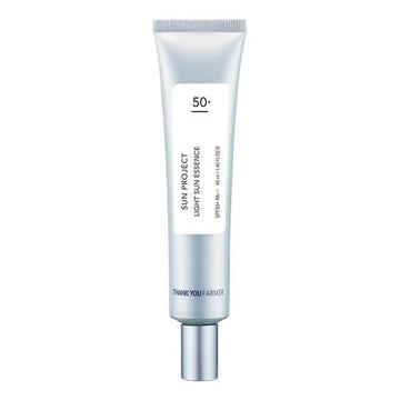 - Thank You Farmer Sun Project Light Sun Essence SPF 50 PA+++ features an ultra-light texture enriched with natural components such as lotus flower water, aloe leaf extract, and althaea rosea flower extract, which aid in rejuvenating rough, damaged skin. It offers protection against UVA and UVB rays with SPF50+ and PA+++. This essence also hydrates, calms, minimizes the appearance of pores, and fortifies the skin barrier with abundant moisture that seamlessly blends with the skin. It imparts a semi-matte, non-greasy finish for a luminous, radiant complexion and is complemented by a refreshing, soothing apricot aroma.