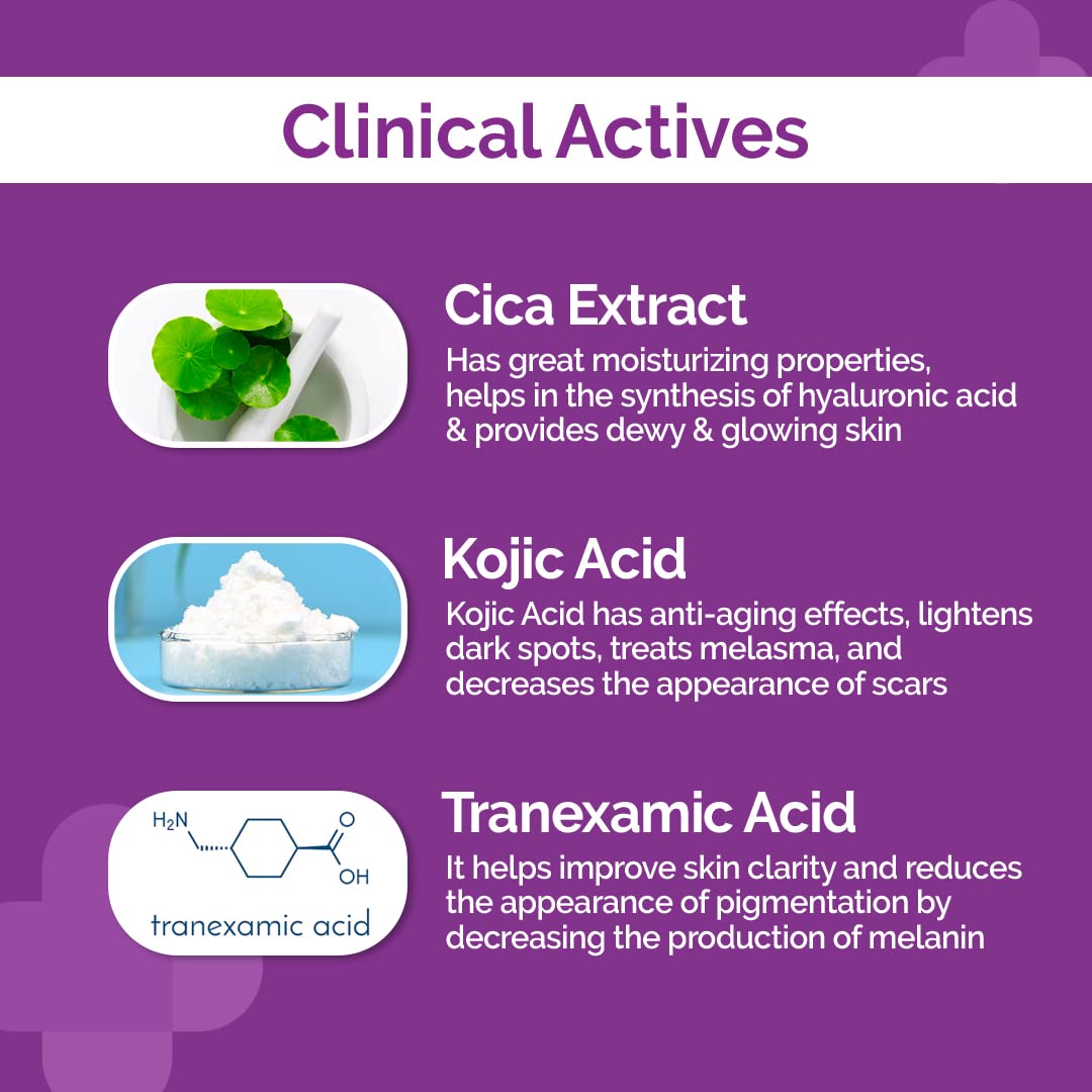 - Welcome to the season of radiance with the 10% Cica-Glow Face Serum, an ultra-light formula that swiftly absorbs into your skin. Enriched with Cica extract, this serum provides deep hydration, leaving your skin luminous. The powerful duo of Kojic Acid and Tranexamic Acid helps to even out your skin tone by diminishing dark spots and regulating melanin synthesis. The highlight? Its anti-inflammatory and antioxidant properties combat damage from free radicals.