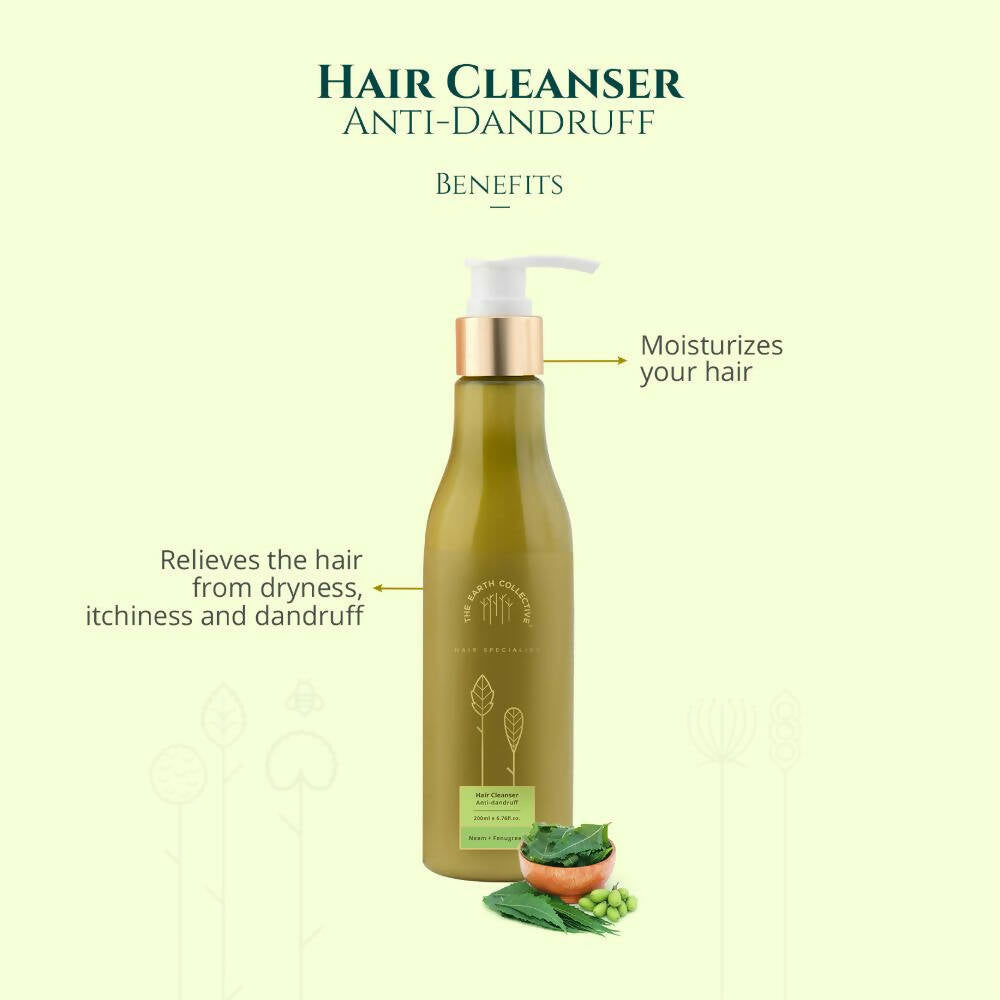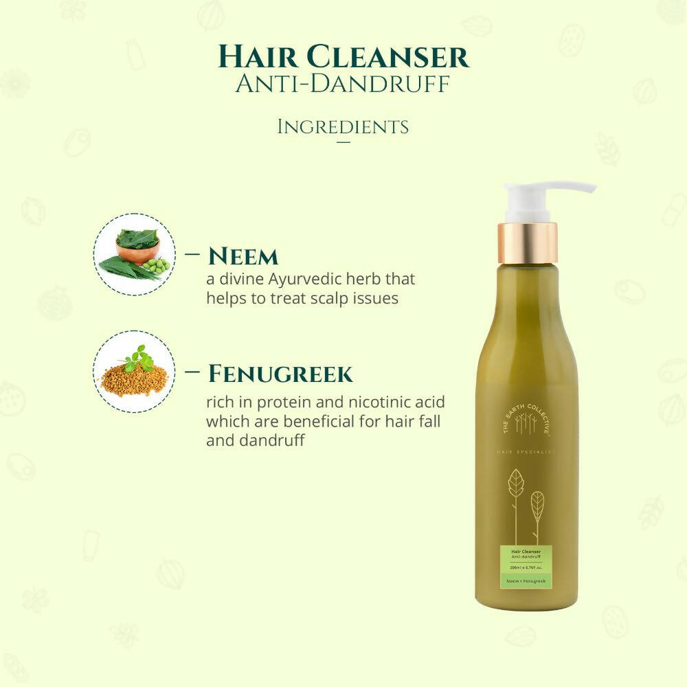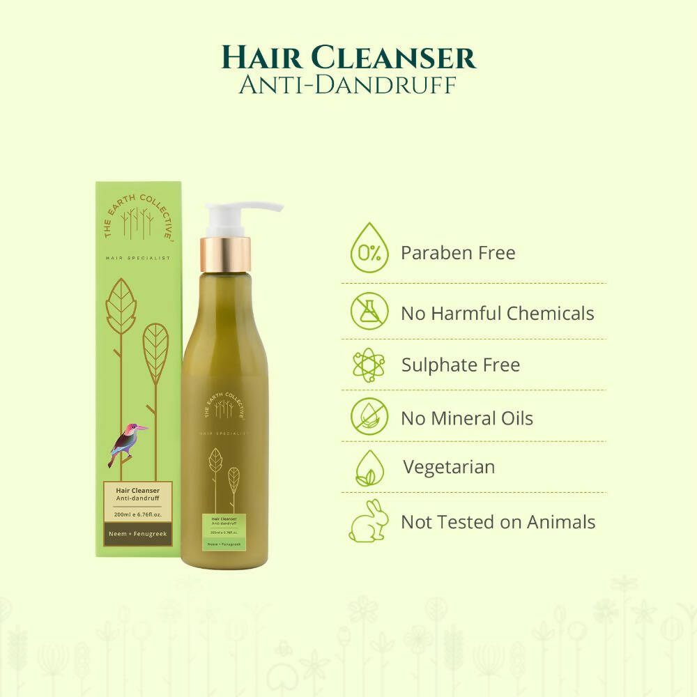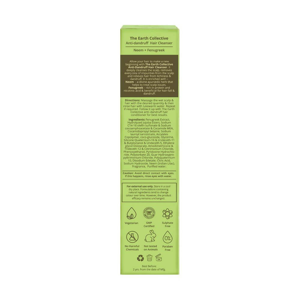 About the Product:- The Earth Collective Anti-Dandruff Hair Cleanser is a superior and gentle hair shampoo that assists in removing impurities, dandruff, and flakes from the scalp while alleviating itchiness. Infused with the benefits of antiseptic neem and protein-rich fenugreek, this mild cleanser aids in reducing dandruff and hair fall and is suitable for every hair type. This anti-dandruff shampoo is crafted with certified ingredients sourced from esteemed international suppliers.