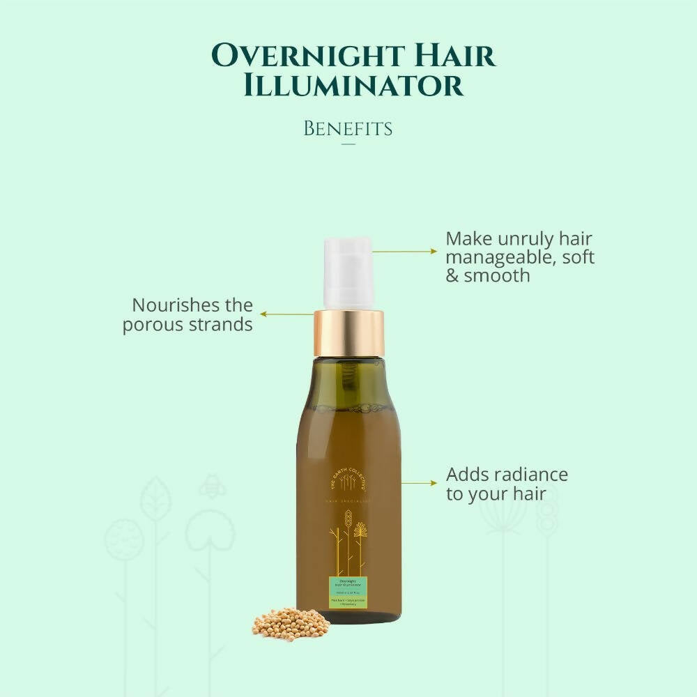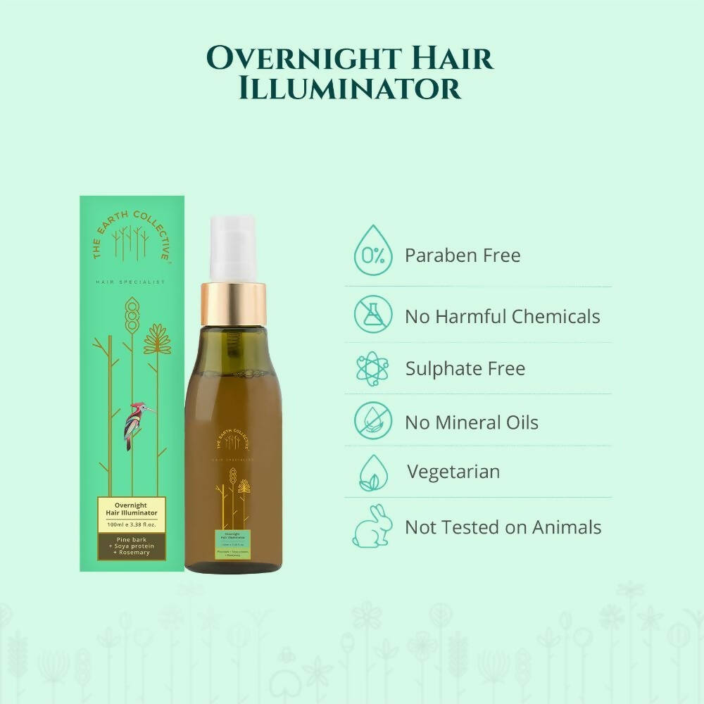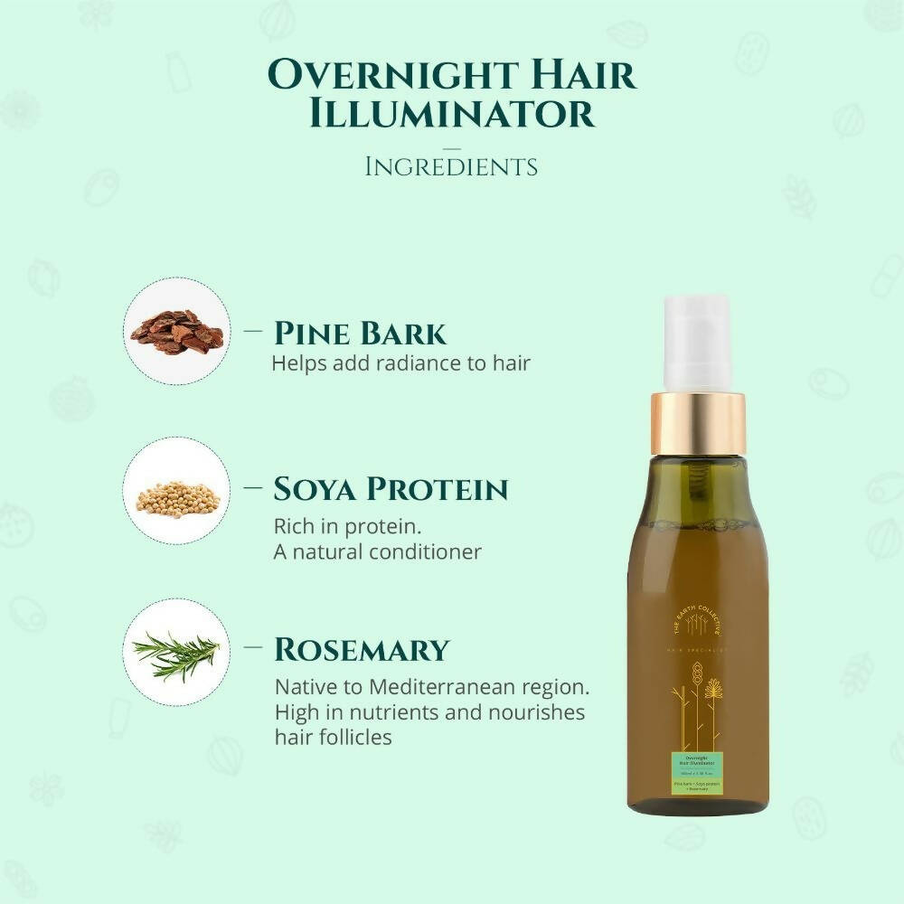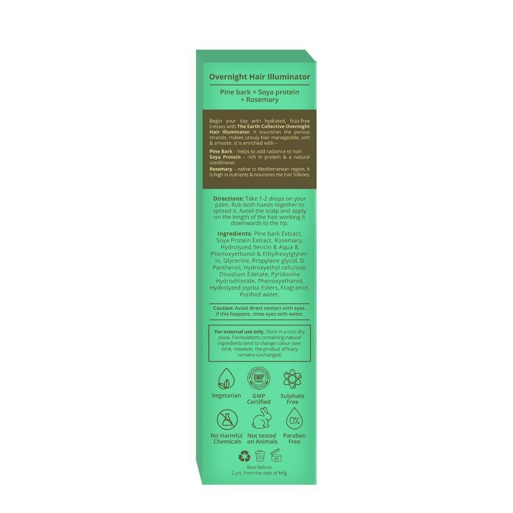 About the Product:- Start your morning with well-moisturized and frizz-free locks thanks to The Earth Collective Overnight Hair Illuminator. This is the ideal component for your evening hair regimen. Infused with pine bark, soya protein, and rosemary, it revitalizes porous strands and tames wild hair. Awaken to hair that is soft, sleek, and free of frizz. Pine bark enhances the hair's luster. Soya protein functions as a natural conditioner, improving hair's smoothness, strength, and nourishment. Rosemary fortifies hair follicles, thereby promoting hair growth. Formulated with certified ingredients sourced from esteemed international suppliers, The Earth Collective Overnight Hair Illuminator hydrates your hair, moisturizes strands, and minimizes frizz. Suitable for all hair types, it is especially recommended for those with frizzy and unruly locks.