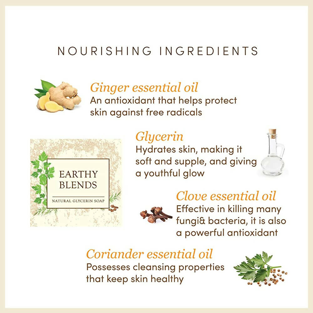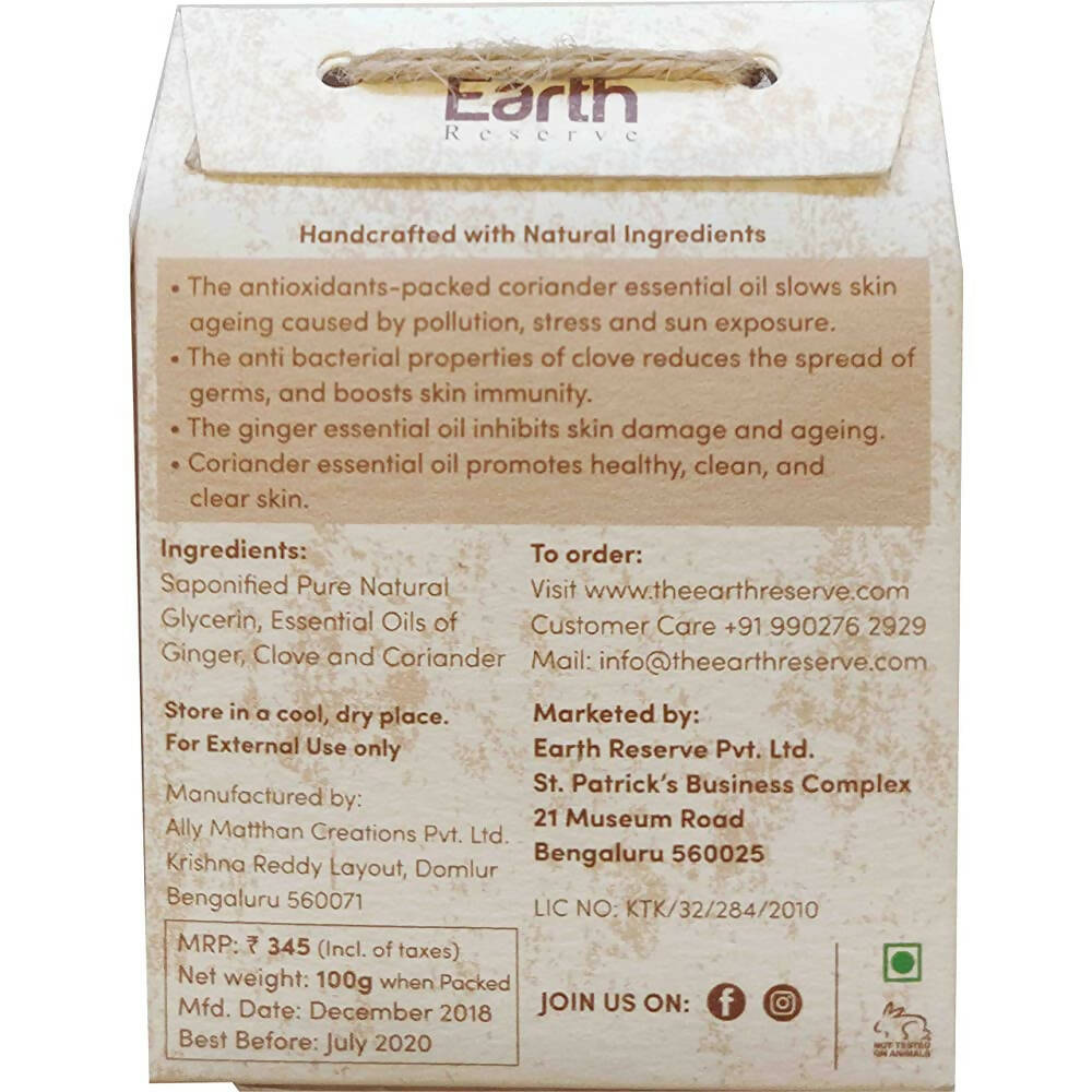 - Ginger and cloves are esteemed for their antibacterial and immunity-enhancing qualities. Coriander is abundant in antioxidants that can decelerate the aging process of the skin. The Earth Reserve Earthy Blends Natural Glycerin Soap combines these elements to assist in caring for your skin.