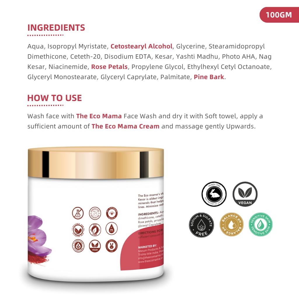 - The Eco Mama skincare collection is derived from nature's finest resources to deliver exceptional skincare. Kesar, an ancient remedy, is renowned for diminishing skin pigmentation. It is abundant in antioxidants, vitamins, and minerals that aid in enhancing skin tone. Niacinamide reduces the appearance of pores and lessens fine lines, while also soothing redness. Yashtimadhu protects against sun damage and lightens dark spots on the skin.