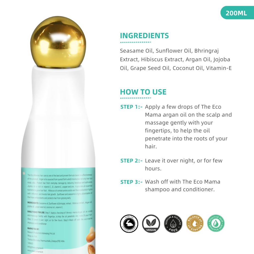 - The Eco Mama hair care formula stands out as one of the finest and most validated solutions in terms of performance. The argan oil used is derived from the purest source, ensuring both hair and scalp are deeply nourished and shielded from everyday harm by minimizing breakage and split ends. Enriched with vitamins C, B, E, as well as copper and zinc, jojoba oil supplies all the vital nutrients needed for rapid hair growth. Hibiscus oil is packed with amino acids and flavonoids, combating infections and fostering healthy hair growth. Sunflower and sesame oils, known for their high absorption, offer antioxidant protection against premature greying.