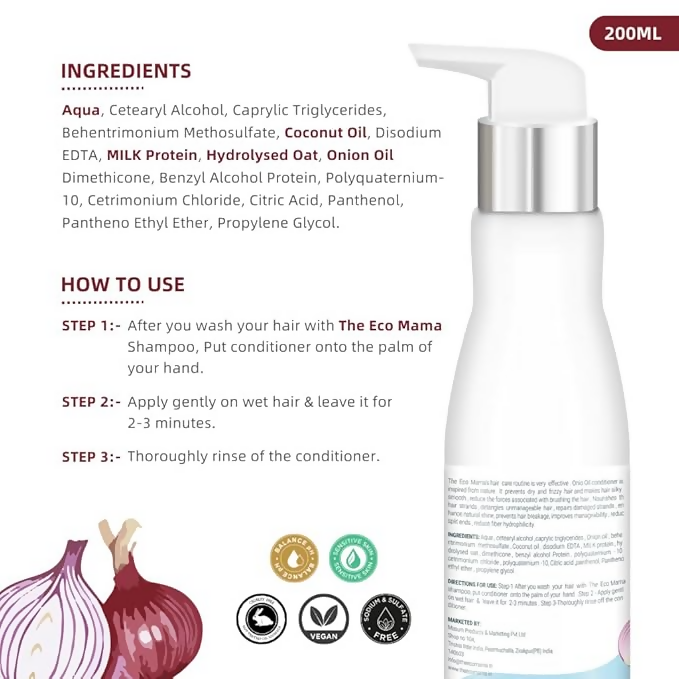 - The Eco Mama hair care regimen is highly effective. This Onion conditioner takes inspiration from nature, with Onion oil that prevents dryness and frizz, leaving hair luxuriously smooth and reducing the effort of brushing. It nourishes hair strands, untangles unmanageable locks, repairs damaged fibers, enhances natural luster, prevents hair breakage, improves manageability, reduces split ends, and decreases fiber hydrophilicity.